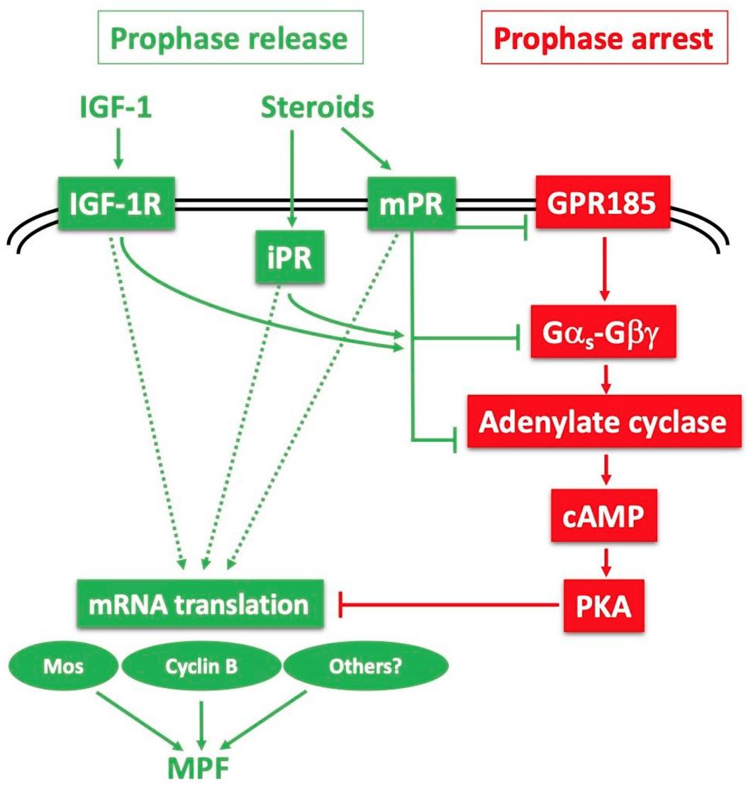 Figure 5. Models for release of the Xenopus oocyte prophase block: probable cooperation between several receptors and downstream pathways. The constitutively active Gαs-coupled GPR185 maintains high cAMP and PKA activity, ensuring the prophase arrest (red pathwayâright). The prophase release (green pathwayâleft) is triggered by steroids, mainly progesterone, with the potential contribution of IGF-1 and its receptor (IGF-1R). Progesterone could interact with its canonical nuclear receptor (iPR) but also a plasma membrane-bound receptor (mPR). Upon binding to progesterone, these receptors could inhibit the GPR185 pathway, and/or independently inhibit adenylate cyclase by recruiting Gαi or inhibiting GαS. They could also launch positive downstream signalling independently of cAMP and PKA. These cascades converge to the synthesis of new proteins required for activating MPF |