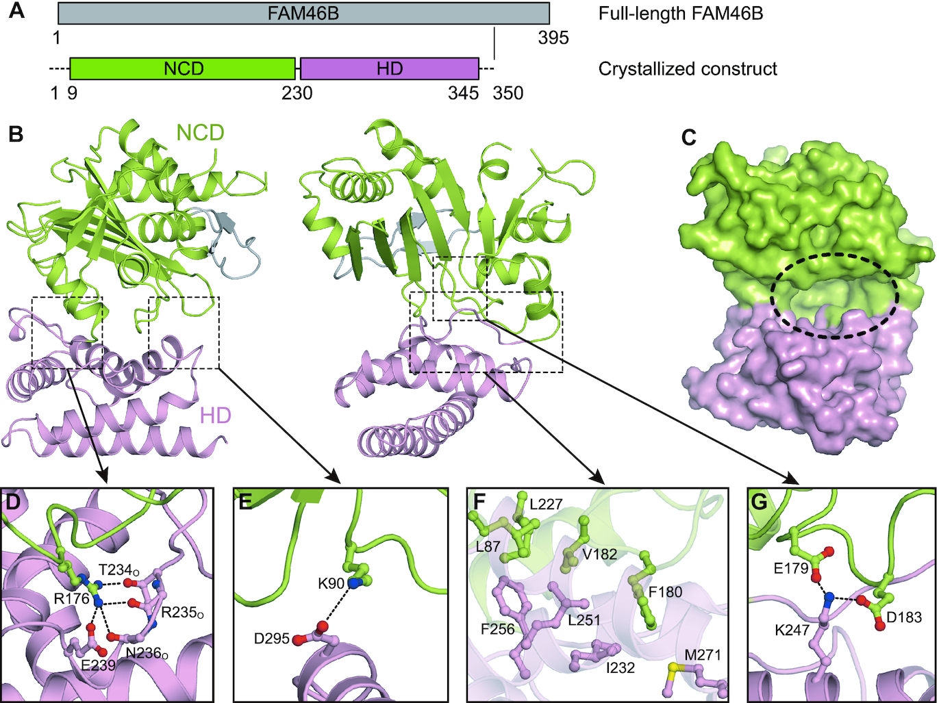 Figure 1. Overall structure of FAM46B. (A) Schematic representation showing the organization of crystallized construct based on full-length FAM46B. NCD, N-terminal catalytic domain; HD, helical domain. Borders of each domain are indicated by residue numbers. (B) Structure of FAM46B. Domains of FAM46B are indicated and colored as in A. The two featured β-hairpin is colored gray. (C) Surface representation of FAM46B with the inter-domain cleft indicated by dashed ellipse. (D–G) Interactions between NCD and HD. Side chains of involved residues are shown as ball-and-stick models in the same color as the domains they belong to.