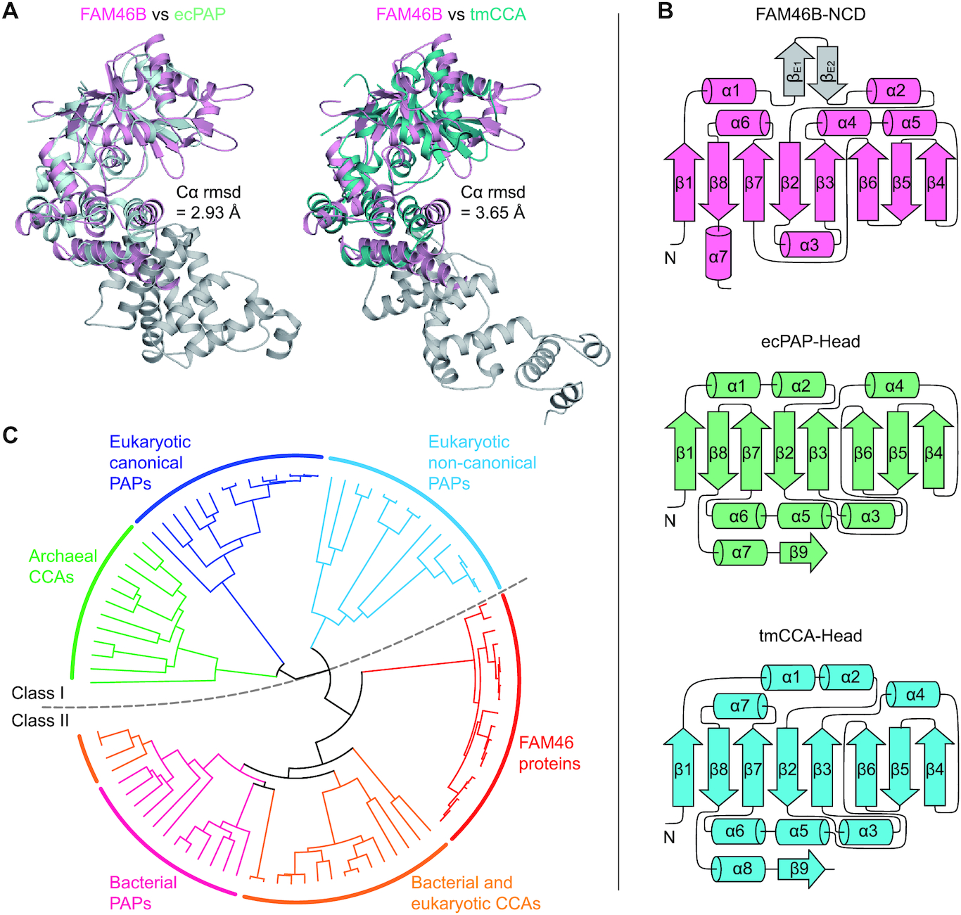 Figure 3. FAM46B is a bacterial-like PAP. (A) Structural comparison between FAM46B and ecPAP (left) or tmCCA (right). FAM46B (magenta) is separately superimposed with ecPAP (Protein Data Bank code 3AQM, pale cyan) and tmCCA (3H39, teal). The r.m.s.d. values of aligned Cα atoms are shown. The body and tail domains of ecPAP and tmCCA are colored grey. (B) The topology diagram of the FAM46B NCD (top), as compared with those of the head domains of ecPAP (middle) and tmCCA (bottom), colored as in A. (C) The phylogenetic analysis revealing a close relationship between FAM46 proteins and bacterial PAPs. Subtypes of PAPs and CCAs are color-specified. Class I (cool colors) and II (warm colors) PAPs/CCAs are separated by a dashed line.