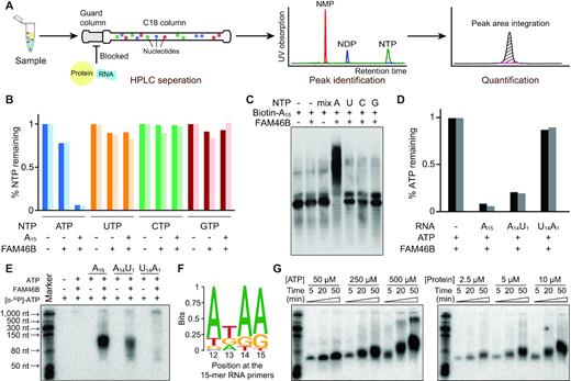 Figure 5. The substrate sequence preference of FAM46B. (A) Schematic drawing showing the experimental process of HPLC-based NTP consumption assay. (B) Consumption of different NTPs by human FAM46B. Results from two independent experiments are presented. (C) In vitro polyadenylation assay showing FAM46B extends 5â²-biotinylated A15 primer only in the presence of ATP. (D) ATP consumption of FAM46B in the presence of different RNA primers. (E) Polyadenylation assay showing the AMP incorporation to different RNA primers by FAM46B. (F) Position-dependent nucleotide frequency of substrates extended by FAM46B. (G) Progressive polyadenylation activity of FAM46B, shown by ATP (left panel) or protein (right panel) concentration-dependent ATP incorporation in the presence of A15 primer.