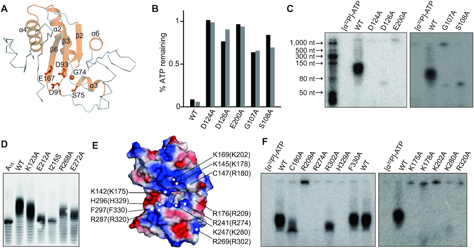 Figure 6. Critical sites of FAM46B for polyadenylation activity. (A) The NTase core of FAM46B. The consensus NTase motif is highlighted as cartoon representation in orange. The conserved key residues are shown as sticks-and-ball models. (B) ATP consumption of mutants regarding key residues shown in A. Results from two independent experiments are presented. (C) AMP incorporation of mutants regarding residues shown in A. (D) Polyadenylation activity of human FAM46B mutants regarding residues located in the interface between NCD and HD. (E) Surface electrostatic potential of xtFAM46B. Conserved negatively charged residues that may be involved in RNA binding, together with two hydrophobic residues close to the catalytic center, are specified. Corresponding residues of human FAM46B are indicated in the parentheses. (F) AMP incorporation of mutants regarding residues shown in D.
