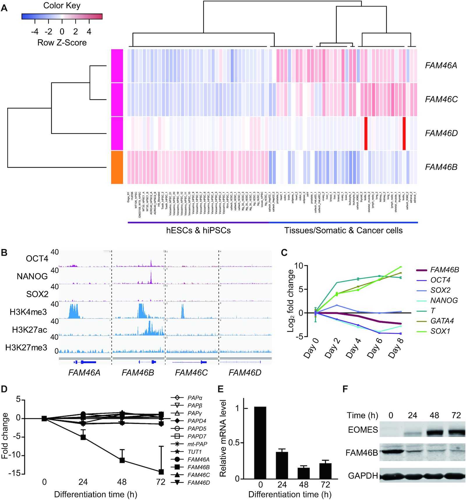 Figure 7. FAM46B is specifically expressed in human pluripotent stem cells. (A) Expression profiles of FAM46 family genes in 12 hESC (H1, H6 and H9), 25 hiPSC samples, 32 normal somatic tissues and 6 cancer cell lines. The rows represent the transcription FAM46 family genes. The RNA-seq data from ENCODE was analyzed, and the RNA expression level was shown as FPKM (fragment per kilobase per million reads). (B) The comparison of chromatin status and pluripotent transcription factor binding sites around the promoters of FAM46 family genes. The promoter of FAM46B is bound by pluripotent transcription factors OCT4, NANOG and SOX2, and marked with transcriptionally active histone marks H3K4me3 and H3K27ac. (C) The mRNA level of FAM46B is gradually decreased during embryoid formation. Fold changes relative to day 0 are plotted for Day 2â8. Error bar indicate s.d. (D) Microarray data showing the relative expression alteration of FAM46 genes together with other canonical (PAPα, PAPβ and PAPγ) and noncanonical PAPs (PAPD4/Gld-2, PAPD5, PAPD7 and mt-PAP) at various time points after induced differentiation of hESCs. Note the declining tendency of FAM46B. Fold changes relative to day 0 are plotted for Day 1â3. Error bar indicate s.d. (E) Relative mRNA levels of FAM46B at various time points after induced differentiation determined by qPCR. mRNA level of FAM46B at day 0 is set to 1. Error bar indicates s.d. (n = 3). (F) FAM46B protein levels at various time points after induced differentiation determined by Western blot. EOMES is the marker for mesendoderm differentiation.