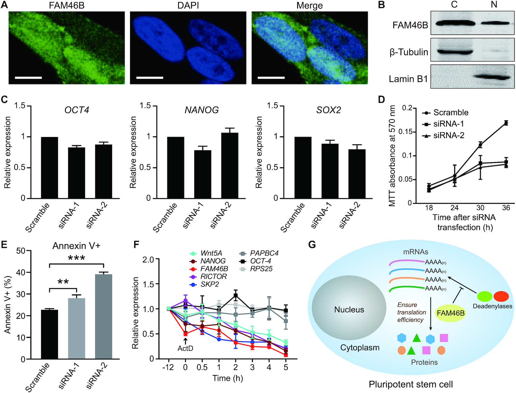 Figure 8. Characterization of FAM46B in hESCs. (A) Subcellular localization of endogenously expressed FAM46B protein in hESCs shown by immunofluorescent staining. Scale bar, 5 μM. (B) Cytosolic (C)/nuclear (N) fractionation experiment showing the subcellular localization of endogenous flag-tagged FAM46B in hESCs. (C) Knock-down of FAM46B did not significantly alter the expression level of OCT4, NANOG and SOX2. Error bar indicates s.d. (n = 3). (D) Knock-down of FAM46B inhibits cell viability in MTT assay. (E) Flow-cytometry assay showing knock-down of FAM46B leads to hESC apoptosis. Significance was calculated with two-sided Student's t-test (n = 3). **P < 0.01, ***P < 0.001. (F) mRNA half-life of selected genes in response to conditional knock-out of FAM46B in hESCs. Inhibition of cellular transcription by adding ActD was set to time point 0 and indicated by an arrow. (G) Model showing that FAM46B promotes translation in pluripotent cells.