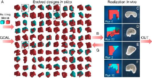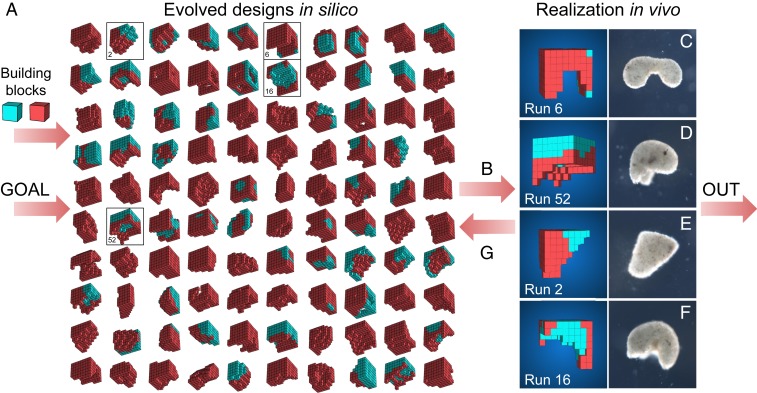 Fig. 1. Designing and manufacturing reconfigurable organisms. A behavioral goal (e.g., maximize displacement), along with structural building blocks [here, contractile (red) and passive (cyan) voxels], are supplied to an evolutionary algorithm. The algorithm evolves an initially random population and returns the best design that was found. The algorithm is rerun 99 times starting with different random populations, generating a diversity of performant designs in silico (A; SI Appendix, section S5). Performant designs are then filtered by their robustness to random phase modulation of their contractile cells (B; SI Appendix, section S7), constructed in vivo using developing Xenopus cardiomyocyte and epidermal cell progenitors (CâF; SI Appendix, section S8), and placed on the surface of a Petri dish where their behavior is observed and compared to the designâs predicted behavior (SI Appendix, section S9). Discrepancies between in silico and in vivo behavior are returned to the evolutionary algorithm in the form of constraints on the kinds of designs that can evolve during subsequent designâmanufacture cycles (G; SI Appendix, section S6). Concurrently, tissue layering and shaping techniques are modified such that realized living systems behave more like their virtual model (SI Appendix, section S8).
