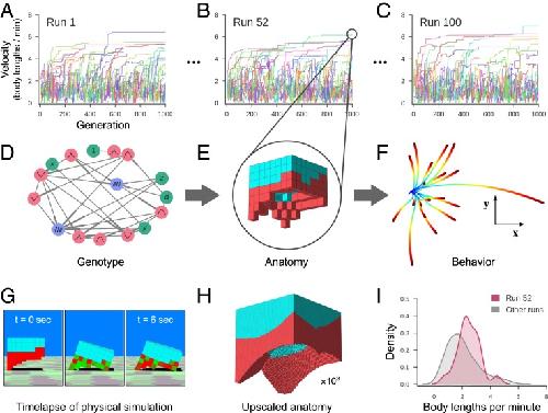 Fig. 2. Designing reconfigurable organisms. For a given goal, 100 independent evolutionary trials were conducted in silico (A–C). Each colored line represents the velocity of the fastest-moving design within its clade. Each genome (D) dictates anatomy and behavior by determining where and how voxels are combined, and whether they are passive (cyan) or contractile (red; E). Genomes simulate a developmental process and are described in more detail in SI Appendix, section S4. The differing behavioral traces produced by a design (F) are a result of randomly perturbing the actuation of each contractile cell during each evaluation period. The behavioral traces all originate from the same position (blue) but diverge over time until their final destination (red). (G) During one evaluation period, after settling under gravity for 1 s, compressed and expanded contractile voxels are shown in red and green, respectively. Because the genotype is scale-free, the anatomical resolution of any design can be increased (H) while preserving geometry (but not necessarily behavior). When all evolutionary trials complete, the most performant design from each trial is extracted (I). The robust design passed to the next stage of the pipeline moves, on average, more rapidly (red curve) than the average speed of the other 99 designs (gray curve).