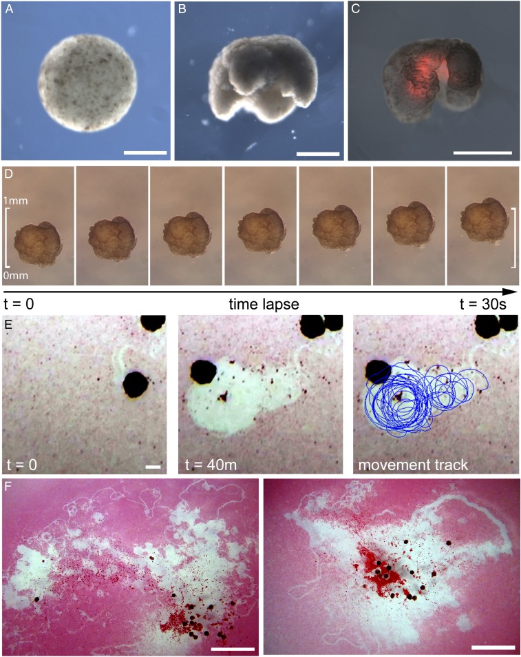 Fig. 3. Manufacturing reconfigurable organisms. (A) Aggregation of pluripotent blastula cells harvested from X. laevis embryos. (B) Shaping results in 3D representations of the evolved in silico designs. (C) Layering of cardiac progenitor cells results in contractile cardiomyocytetissue at specific locations, visualized by red fluorescent lineage tracer. (D) Time-lapse imaging of self-locomotion in an aqueous environment. (E) Emergent behavior of debris aggregation by an individual within the environment and (F) by groups of reconfigurable organisms over a 24-h period (SI Appendix, section S10.4). (Scale bars: 500 μm for AâE and 5 mm for F, respectively.)