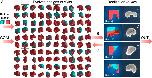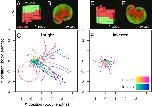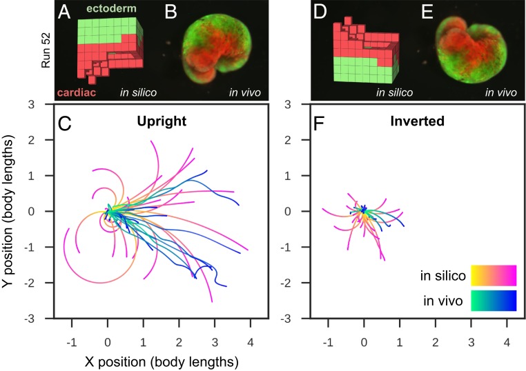 Fig. 4. Transferal from silico to vivo. The first design selected for fabrication and specific hypothesis testing (A) was the most robust yet stable and energy-efficient configuration of passive (epidermis; green) and contractile (cardiac; red) tissues found by the evolutionary algorithm. The design was evaluated 25 times for 1 min of simulation time, resulting in 25 movement trajectories (pink curves in C). Six reconfigurable organisms were built which embodied this design (e.g., B) (SI Appendix, section S9). Three were evaluated four times and the other three were evaluated five times for 10 min each (27 blue curves in C). The organismsâ direction of movement matched the designâs predicted direction of movement (P < 0.01; details in SI Appendix, section S9). To determine whether the organismsâ movement was a result of chance or due to the designâs evolved geometry and tissue placement, geometry and tissue distribution was altered by rotating the design 180° about its transverse plane (D) and evaluating it another 25 times in silico (pink curves in F). Each of the six organisms were likewise inverted (E): four were evaluated five times while the remaining two were only evaluated once (22 blue curves in F). Inverting the design significantly reduces its net displacement (P < 0.001), as did inverting the organisms (P < 0.0001).