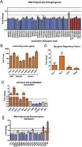 Fig. 6. Downregulation of Pol III activity in a myogenic explant model. Overexpression of Fgf4 â+ âWnt8 in NF Stage 25 X.tropicalis animal explants results in a downregulation of RNA Polymerase III transcripts and an upregulation of mRNAs associated with myogenic differentiation. Expression fold change summary of X.tropicalis NF Stage 25 animal cap explants dissected from embryos injected with 5pg Fgf4 and 50pg Wnt8 mRNA compared to explants taken from control uninjected embryos across 3 biological replicates. Only RNAs with raw signal intensities of >10 were included in the analyses. (A) RNA Polymerase III target genes (significantly altered tRNA isoacceptor families are in blue, other significantly altered RNA Polymerase III targets are shown in red). (B) Contractile protein gene expression is highly upregulated (note the log scale). (C) Expression of the Myogenic Regulatory Factor (MRF) genes is also upregulated in Fgf4 â+ âWnt8 explants. (D) Selected genes associated with pluripotency and cell cycle regulators are differentially affected in Fgf4 â+ âWnt8 explants. (E) Overexpression of Fgf4 â+ âWnt8 in NF Stage 25 animal cap explants results in downregulation of some genes coding for proteins associated with RNA Polymerase III core transcription machinery. Pink in all panels indicates no significant change in expression, while blue is significantly down and orange is significantly up. SEM is presented as error bars and * indicates the level of statistical significance between control and injected samples after Bonferroni Correction. |