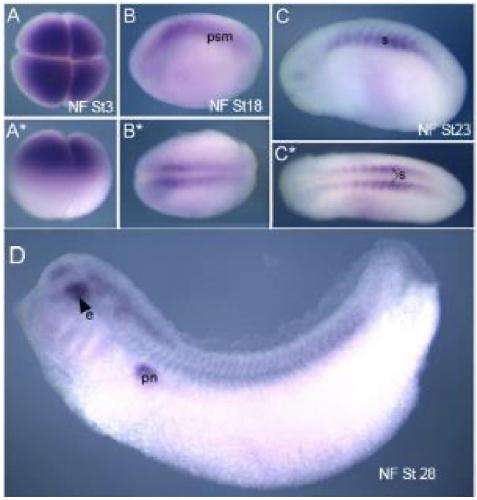 Supplemental Figure 1 Expression of PolR3G during Xenopus tropicalis development. (A-D) In situ hybridisation of X.tropicalis stage series for Polr3G. Embryos were collected at cleavage (4-cell) (A-A*), late neural (St18) (B-B*), early tailbud (St23) (C-C*) and late tailbud (D) stages. e=eye psm=pre-segmented mesoderm; pn=pronephros, s=somites. |