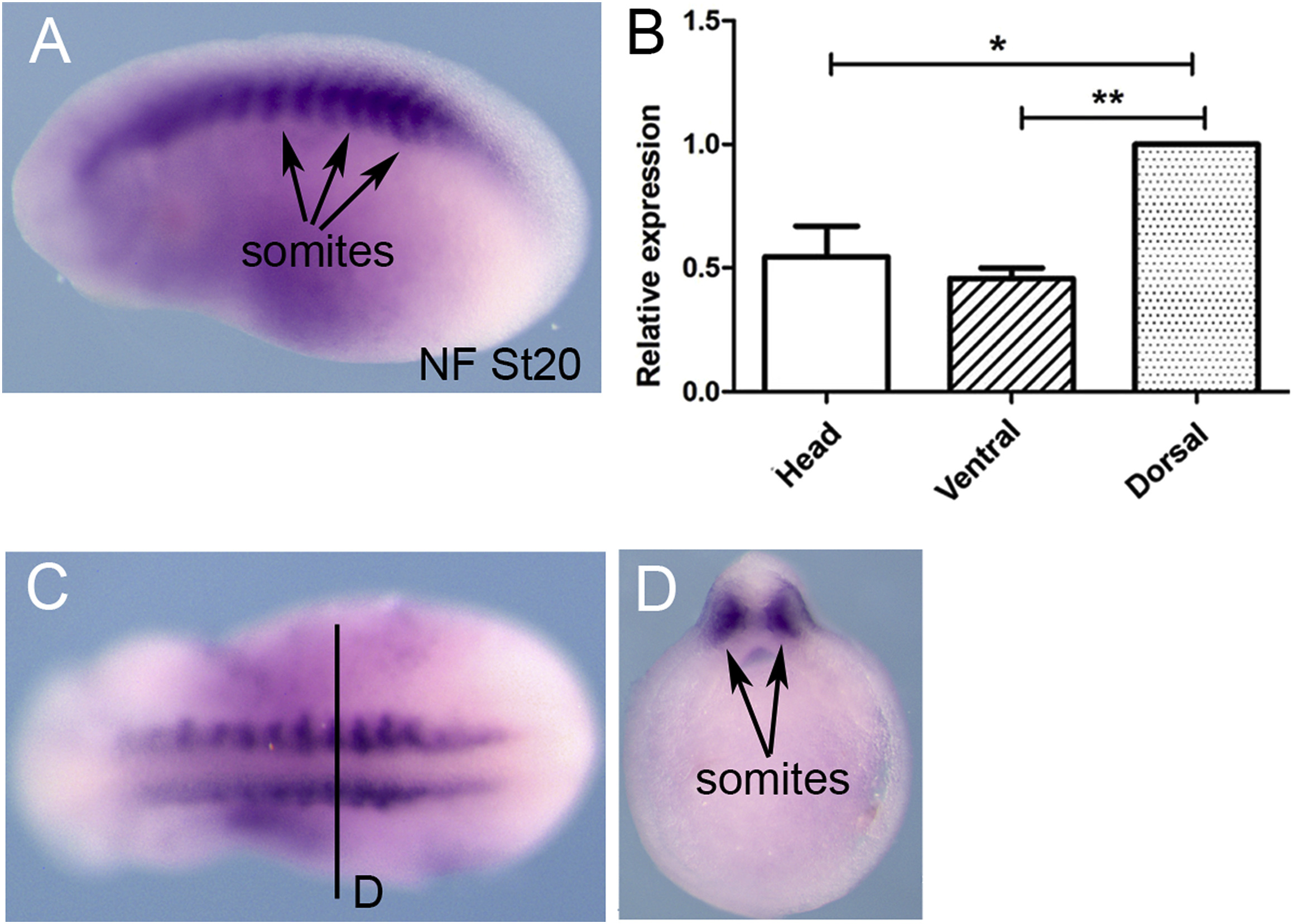 Fig. 2. Expression of Polr3g in Xenopus tropicalis embryos. Expression analysis of Polr3g Xenopus tropicalis at NF stage 20. (A) Lateral view of NF St20 embryo analysed by in situ hybridization for Polr3g; expression in the somites is indicated; anterior is to the left. (B) qRT-PCR for Polr3g expression in the early tailbud (NF St23). Head, Ventral and Dorsal sections were dissected and RNA extracted for qPCR. Ct values were normalised to the gene Dicer. All expression values were calculated relative to somite expression. One-way ANOVA statistical analysis was carried out on relative expression of each section for each gene (*) represents the level of significance. (C) Dorsal view of NF St20 embryo analysed by in situ hybridization for Polr3g; a cross-section through the embryo shown in (D) is indicated; anterior is to the left. (D) Cross section of embryo shown in (C) shows specific expression of Polr3g in somites at NF St20. |