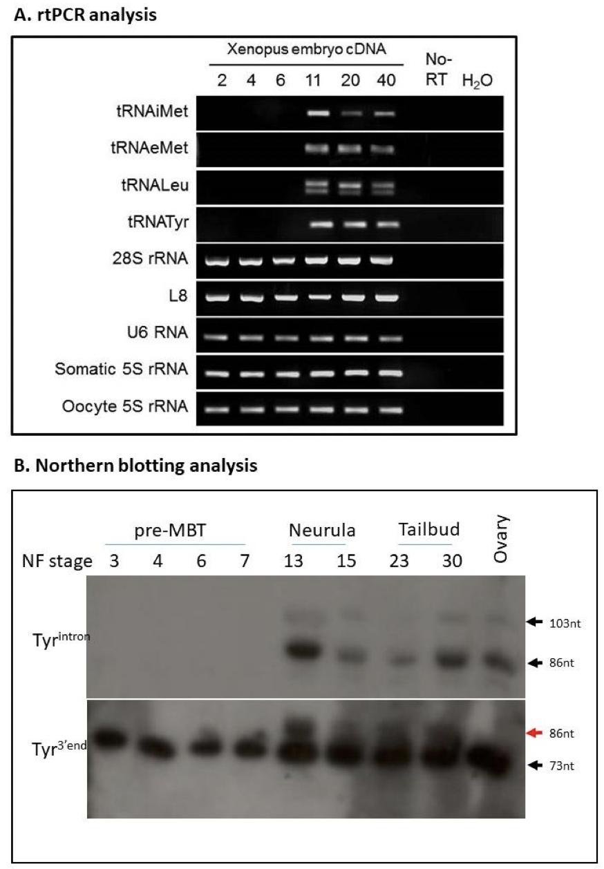 Supplemental Figure 3 3A RT-PCR analysis of tRNA transcription for selected families of tRNAs Tyr (GTA), Leu (CAA), iMet and eMet (CAT) at pre-MBT stages 2-6 and post MBT stages 20, 40. The RNA polymerase III target U6 RNA was also included as another Polymerase III transcriptional target and the gene Dicer was included as a normalisation control. RT-PCR shows a failure to detect tRNA prior to the activation of zygotic transcription; new transcripts are detected. 3B Northern analysis of tRNA Total RNA was extracted from 10 X. tropicalis embryos at the indicated developmental stage. RNA was run on a 6% Acrylamide/Urea gel and transferred to nitrocellulose. Probes were 22nt oligos end-labelled with P32. Northern blotting confirms the presence of mature tRNAs (73nt) in Xenopus embryos throughout early development using a probe against the 3âend of the mature transcript. The activation of new tRNA transcripts is detected using a probe against the intron revealing bands at 103nt and 86nt that are unprocessed tRNA transcripts. tRNA Tyr intron sequence: ACCTAAGGATTGCTGTATCACACC; tRNA Tyr 3â sequence: TCCTTCGAGCCGGAATTGAACCAG. |