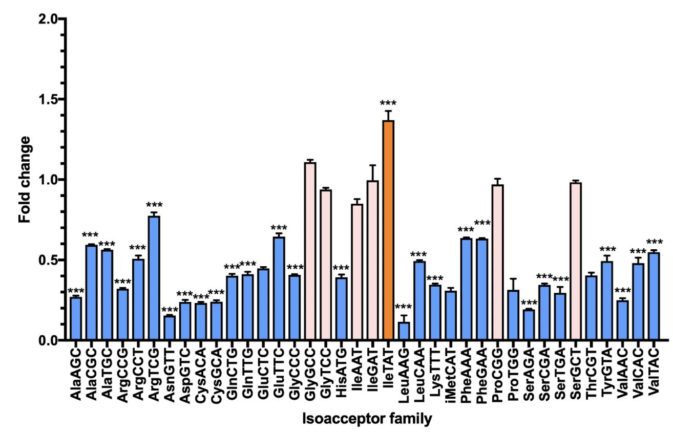 Supplemental Figure 5 Transcription of tRNAs is downregulated in differentiating dorsal regions at NF stage 25 compared to undifferentiated stage 9 embryos. Expression fold change summary of tRNA isoacceptor familes with expression values of >10 in control NF stage 25 dorsal regions compared with control NF stage 9 embryos. Normalised expression values across 3 biological replicates were averaged and analysed by paired t-test. SEM is presented as error bars and * indicates the level of statistical significance after an adjusted p value is calculated by Bonferroni Correction. |