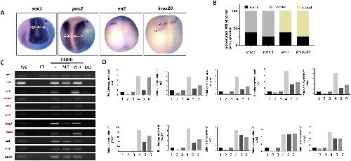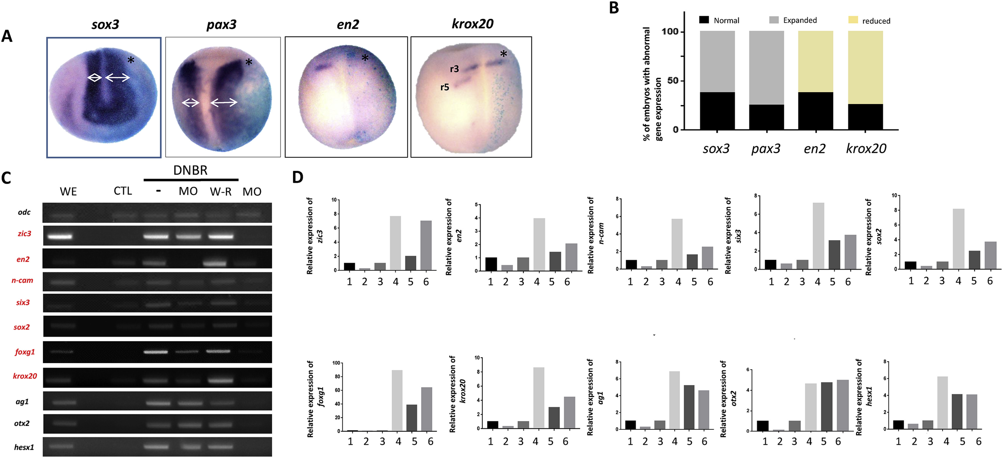 Fig. 3. dach1 is essentially required for neural induction and development. (A) dach1 morpholino oligonucleotide (MO) was microinjected into the one side of two-cell stage Xenopus embryos together with β-galactosidase mRNA. The uninjected side served as an internal control. The embryos were fixed at the neurula stage and analyzed for the expression of neural markers (sox3, pax3, en2, and krox20) using WISH. In-situ hybridization clearly showed that sox3 and pax3 exhibited expansion on the injected side of the embryos compared with the control. However, en2 and krox20 expression were reduced compared with the control. krox20 expression was remarkably reduced at rhombomere 5 (r5) compared with r3 on the injected side of the embryos. (B) Statistical analysis of the embryos injected with dach1 MO showed that approximately 62% exhibited expanded expression of sox3, while 75% exhibited expanded expression of pax3. Reduced expression of krox20 and en2 was observed 74% and 62%, of embryos respectively. (C) Animal caps were processed for RT-PCR using standard protocols and analyzed for different neural markers. The expression of zic3, en2, n-cam, six3, sox2, foxg1, and krox20 was significantly reduced by dach1 depletion compared with the control. In contrast, the expression of ag1, otx2, and hesx1 was unaffected by dach1 knockdown. odc was used as the loading control. (D) Statistical analysis clearly shows that the expression of zic3, en2, n-cam, six3, sox2, foxg1, and krox20 was significantly reduced by dach1 knockdown exhibiting highest reduction percentage of 76% for zic3, whereas the percentage reduction for n-cam, krox20, and en2 was 66%, 62%, and 61%, while 58% reduction for foxg1 and sox2 and 52% for six3, was observed respectively. However, the expression of ag1, otx2, and hesx1 was unaffected. 1 = whole embryo, 2 = dach1 MO, 3 = control, 4 = dnbr, 5 = dnbr + dach1 MO, 6 = dach1 MO + dach1â mRNA.