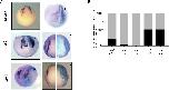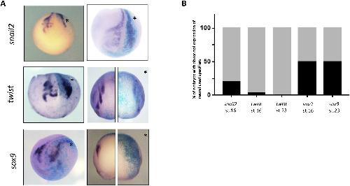 Fig. 4. dach1 is indispensable for neural crest migration during Xenopus embryonic development. (A) dach1 microinjection significantly altered the expression of neural crest specifiers (NCSs) on the injected side of the embryos. The expression of snail2, twist, and sox9 was observed at stage 16 and 23 of embryonic development and was misregulated on the injected side of the embryos compared with the uninjected side. Migration defects were observed at both stages of development. (B) Graphical representation of migration defects observed in morphant embryos after dach1 knockdown. Abnormal expression of snail2 on the dach1 morpholino oligonucleotide-injected side of the embryos was exhibited in 80% of the embryos. At stage 16, approximately 96% of embryos exhibited abnormal expression of twist, while at stage 23, 100% of the embryos exhibited reduced expression of twist. In contrast, 55% of embryos exhibited an abnormal expression of sox9 at both stages 16 and 23.