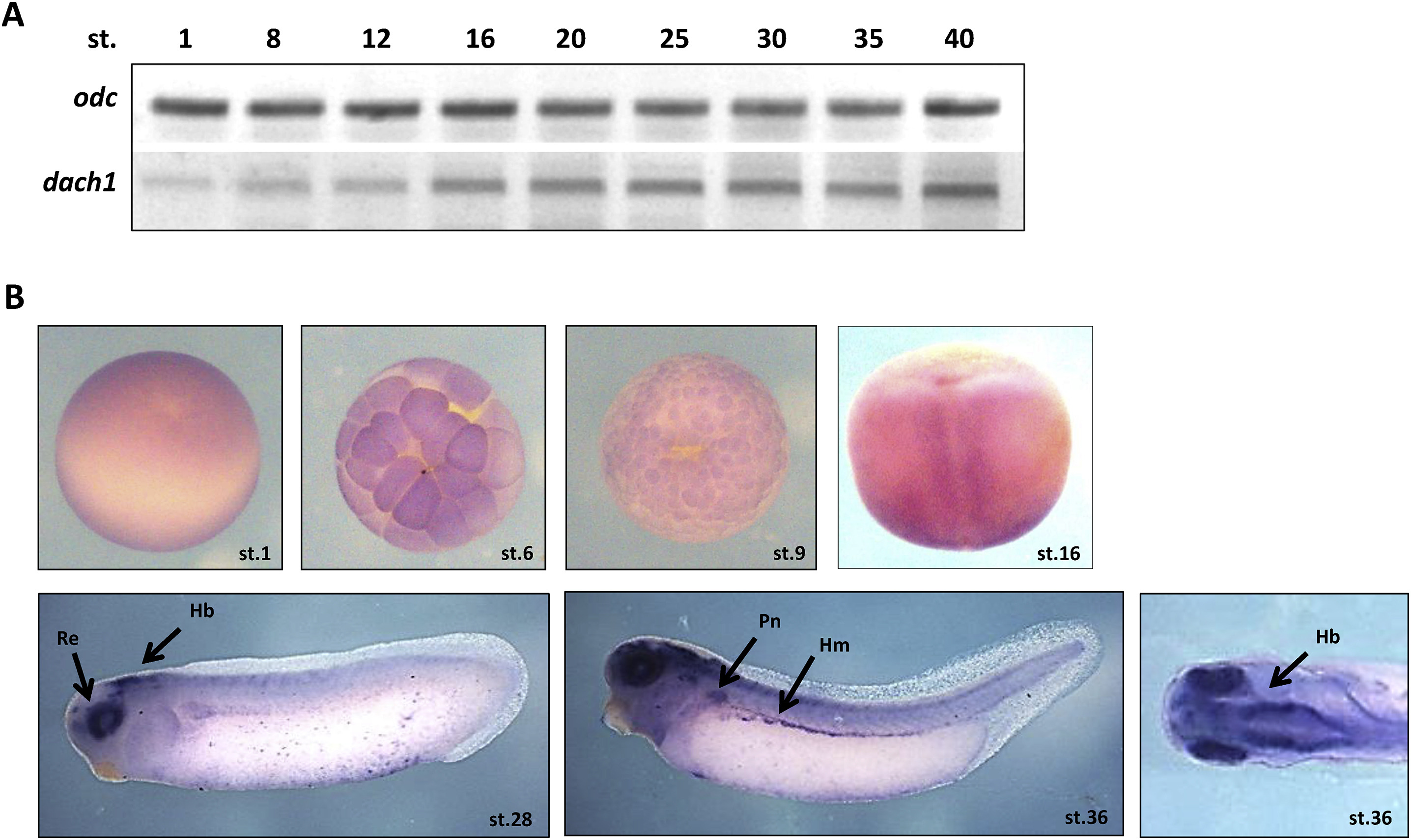 Fig. 1. Spatiotemporal expression pattern of dach1 during Xenopus embryonic development. (A) The temporal expression pattern of dach1 analyzed by RT-PCR indicated the maternal nature of the gene, but enhanced expression was observed at the neurula stage (st. 16) of development. Ornithine decarboxylase (odc) served as the internal control. (B) WISH analysis revealed the spatial expression pattern of dach1 at the neural plate border region at the neurula stage (st. 16) and in the retina (Re), hindbrain (Hb), pronephros (Pn), and hypaxial muscles (Hm) at the tailbud stage (st. 28 and 36).