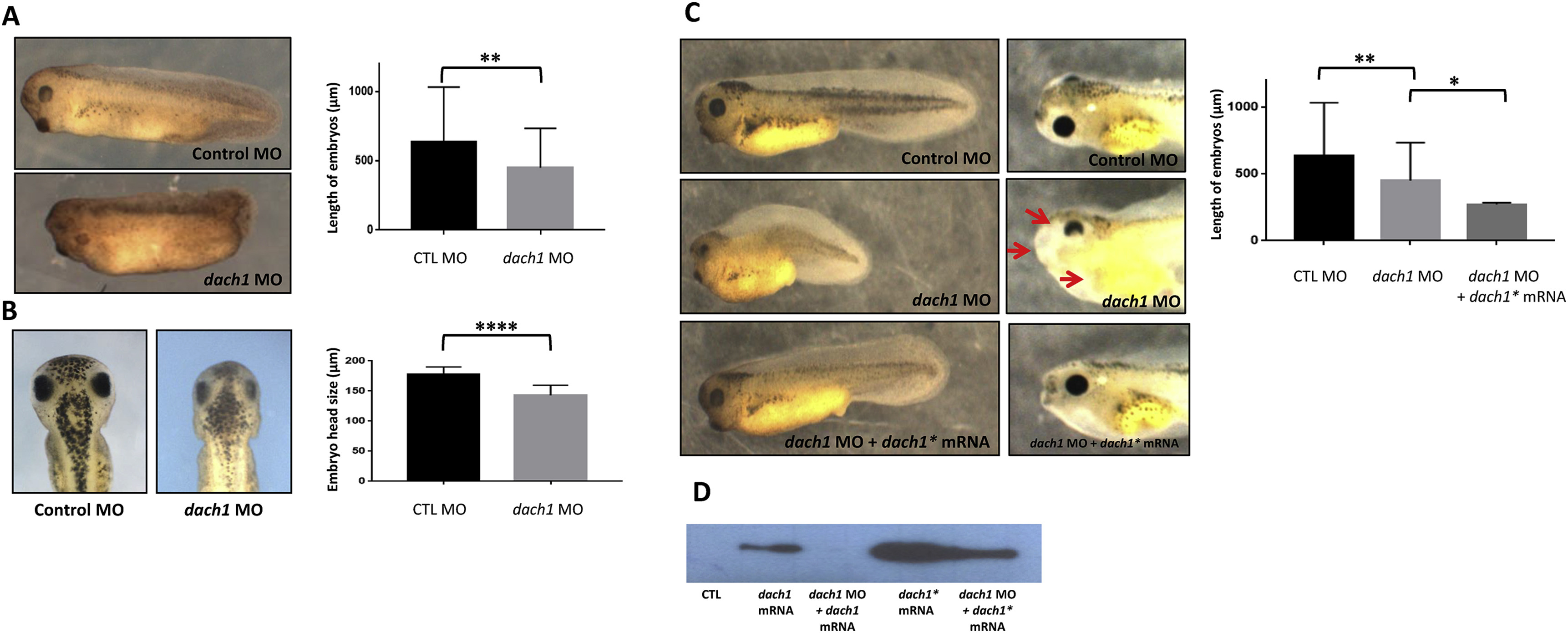 Fig. 2. dach1 knockdown induced microcephaly and body length reduction in Xenopus embryos. (A) Bilateral injection of dach1 morpholino oligonucleotides (MOs) into two-cell stage Xenopus embryos resulted in reduced total body length in morphant embryos. Statistical analysis of the dach1 morphant embryos showed a significant reduction in body length compared with the control embryos. (B) dach1 knockdown in morphant embryos resulted in microcephaly. The graph clearly indicates the reduced head size of dach1 morphant embryos compared with the control embryos. (C) The coinjection of dach1 MO, along with mutant dach1 (dach1â), effectively rescued the malformed phenotypes of microcephaly and reduced length. The graph shows that dach1MO/dach1â coinjection effectively recovered the malformations. (D) Western blot analysis for dach1 RNA did not detect a band for MO-bound dach1 RNA, and protein expression for embryos injected with dach1 or dach1â together with MO revealed the MO specificity for dach1.