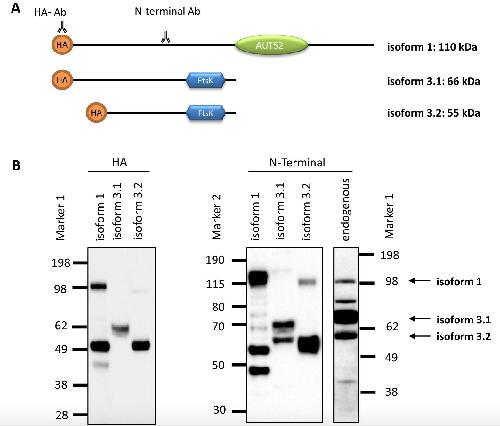 Fig. 3. Western blot analysis of endogenous and transfected FBRSL1 isoforms. a Scheme representation of FBRSL1 isoforms detectable with an N-terminal antibody. The scheme was created using a domain architecture software (https://prosite.expasy.org/mydomains). Isoform 1, consisting of the AUTS2 domain, has a predicted molecular weight of 110 kDa, while isoform 3.1 has a predicted molecular weight of 66 kDa and isoform 3.2 of 55 kDa. Isoforms 3.1. and 3.2 lack the AUTS2 domain and contain a Ftsk DNA translocase domain with an unknown function. b Plasmids containing isoforms 1, 3.1 and 3.2 in fusion to an HA-taq were detected with either an HA-antibody (HA) or with the N-terminal FBRSL1 antibody (N-terminal) in comparison to the endogenous FBRSL1 expression of HEK293 cells. The approximately estimated sizes of 110 kDa, 66 kDa and 55 kDa of the three different isoforms were detected. |