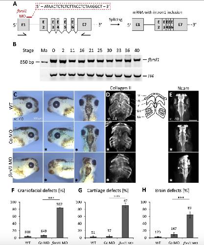 Fig. 5. Fbrsl1 loss-of-function causes craniofacial defects in Xenopus laevis development. a Scheme of the 5â² region of Xenopus laevis fbrsl1 with indicated exons, introns and the fbrsl1 E1/I1 splice-blocking Morpholino target side and possible outcome (mRNA with intron 1 inclusion) after splicing. Xenopus laevis fbrsl1 consists of 19 exons. The Morpholino sequence is given in the red dashed square. Arrows under exon 1 and exon 7 indicate the locations of the forward and reverse primer used for RT-PCR. b RT-PCR analysis of temporal fbrsl1 expression in the oocyte and different developmental stages of Xenopus embryos. RT-PCR analysis of histone H4 serves as loading control. Ma: Marker, O: Oocyte. c Stage 40 wild-type and control Morpholino (10 ng) injected embryos developed normal craniofacial structures and eyes. Injection of 10 ng fbrsl1 MO results in severe craniofacial defects and a reduction of the eye on the fbrsl1 MO injected side (marked by *). d Anti-Collagen Type II immunofluorescence staining of stage 44 Xenopus embryos showing cartilage defects in embryos injected with fbrsl1 MO but not in wild-type or Co MO injected embryos. M: Meckelâs, Q: quadrate, C: ceratohyal, BH: basihyal, BA: branchial arches. Scale bar represents 500 µm. e Anti-Ncam immunofluorescence staining of stage 40 Xenopus embryos shows normal brain development in control embryos, but reduced Ncam expression in embryos injected with fbrsl1 MO. f, g, h The graphs summarize craniofacial, cartilage and brain defects of at least three independent experiments; number of embryos (n, above each bar) and standard errors of the mean are given. ***pâ<â0.001 in a Studentâs t-test and a one-way ANOVA test |