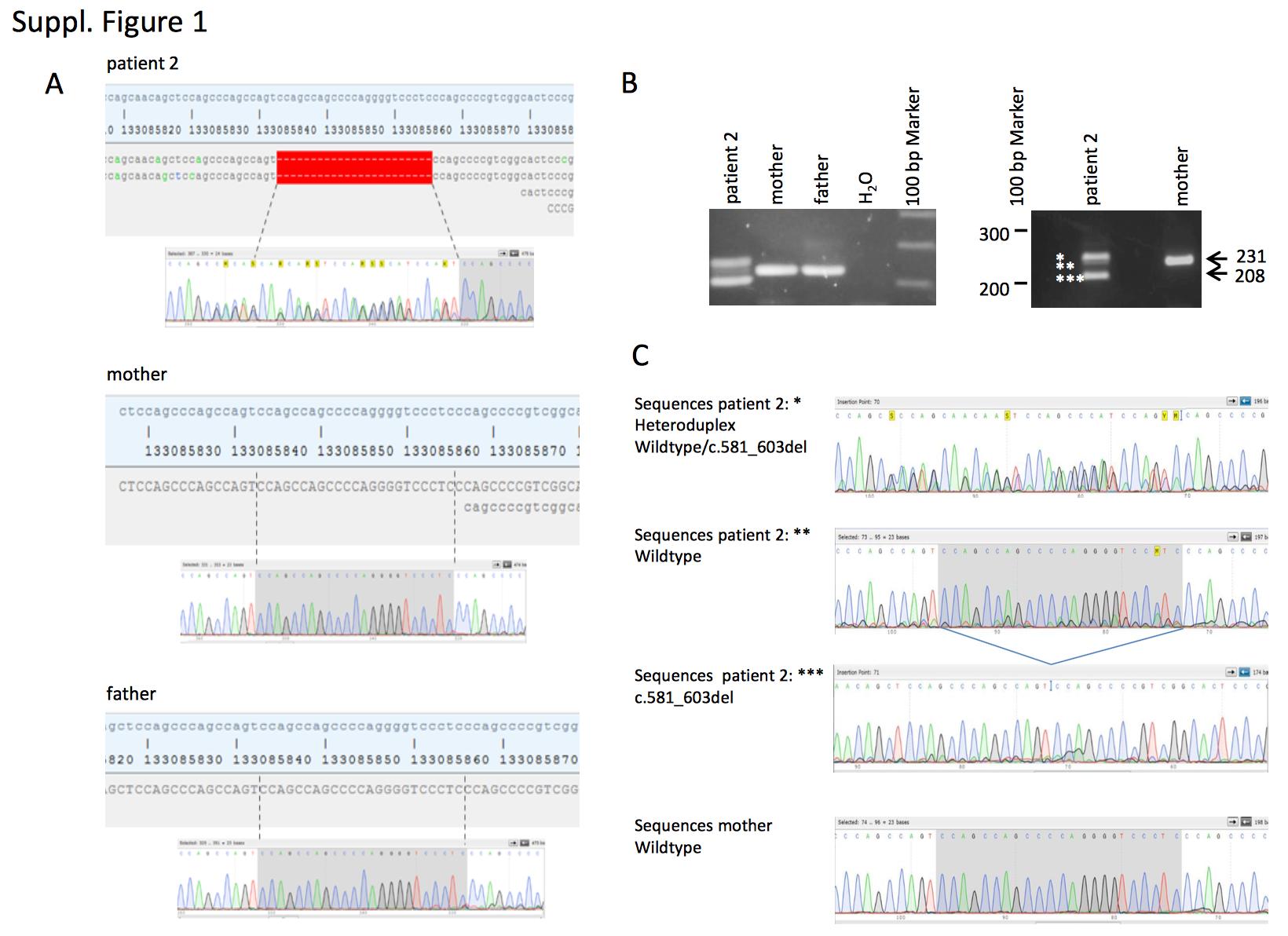 A. For patient 2, only two reads were observed in Varbank for region 12:133085800-133085880 (GRCh37/hg19), each of which showed a 23-bp deletion (12:133085843-033085866), while for the parents only one read without deletion was detected. Sanger sequencing of genomic DNA for this region confirmed the wild-type sequence in the healthy parents and indicated a heterozygous status (frameshift) for the 23-bp deletion in the patient.