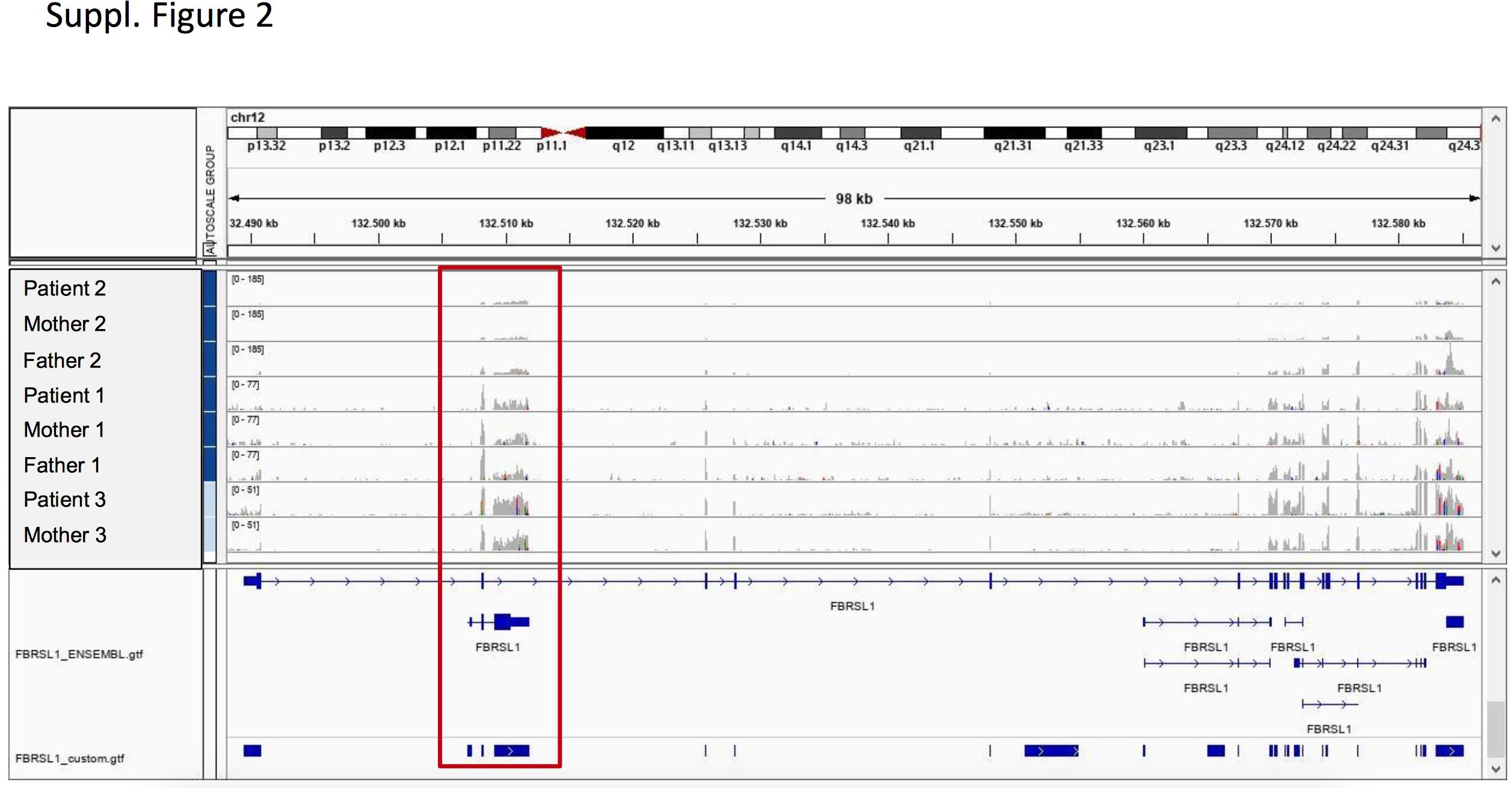 Supplementary Figure 2: RNA-Analysis revealed that all three muations escaped the mechanism of NMD. Reads mapped to gene FBRSL1 were visualised using Integrated Genome Viewer (IGV) version 2.8.2, with the samples ordered by family (patient1 with parents 1, patient 2 with parents 2 and patient 3 with mother 3). The reads were scaled by family, such that the read counts of FBRSL1 for each child are directly comparable to the read counts of FBRSL1 in the parents. The annotation (bottom panel) displays two tracks, the first being of FBRSL1 annotated by ENSEMBL hg38 version 97, and the second containing custom annotation of FBRSL1 including exon 3 |