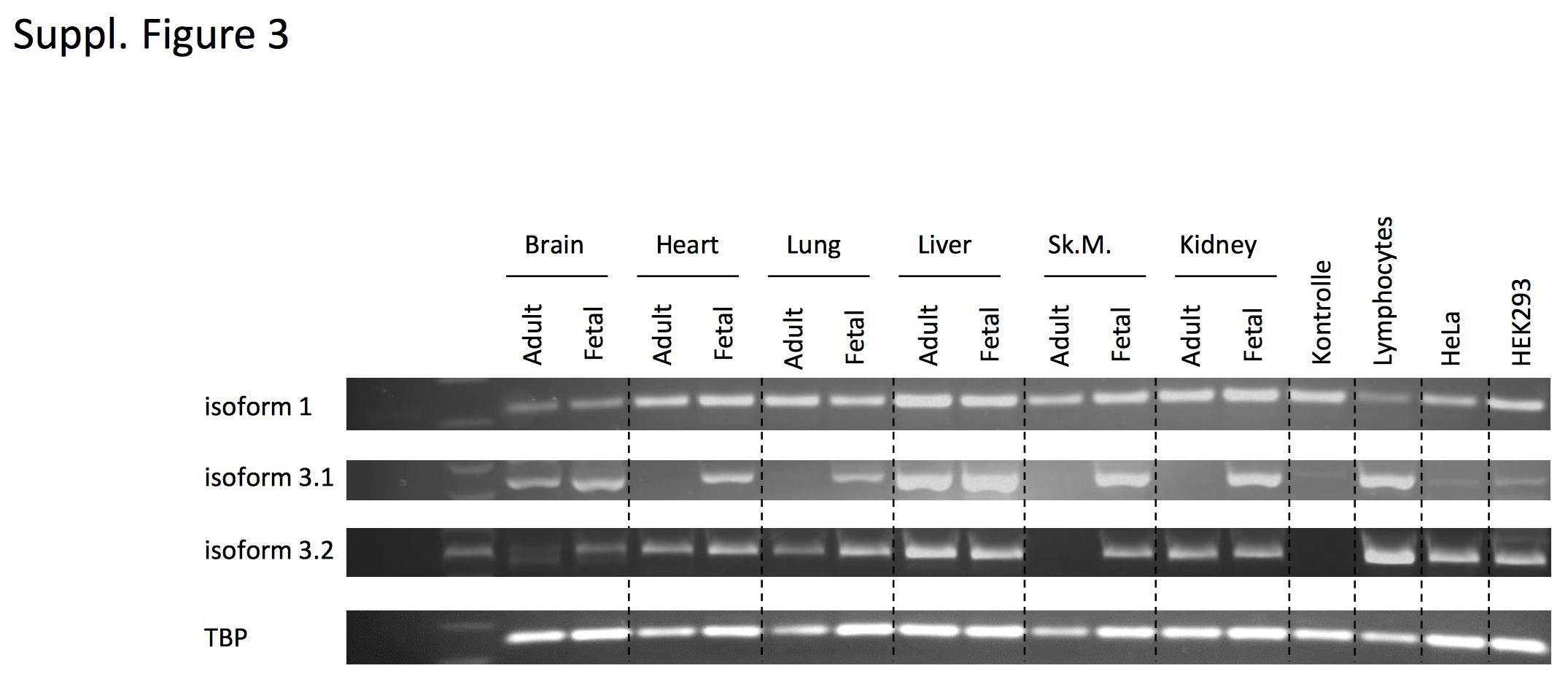 Supplementary Figure 3: Expression analysis performed by RT-PCR on human fetal and adult tissues using cDNA panels (Clontech). In addition RT-PCR analysis was performed on RNA isolated from human lymphocytes and HeLa and HEK293 cells. For isoform 1, a ubiquitous expression pattern was observed, as well as for isoform 3.2, while isoform 3.1 shows a clear expression in fetal tissues, with partial lack of expression in the adult tissues |