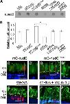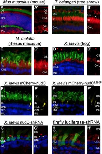 Figure 2- NudC and nudCL280P localizes to the IS and ONL of photoreceptors and can be knocked down upon expression of shRNA against nudC. AâD) IHC of retinal cryosections probing with antibody indicates endogenous nudC (red) is expressed throughout the retinas of mice (A) and is primarily localized to the IS of tree shrew (B ), monkey (C ) and frog (D ) retinas. Photoreceptors are counterstained with WGA (green). NudC stains the axoneme of cone cells (B). A â²âD â²) View of endogenous nudC IHC shown without counterstains. E, F) Expression and localization of mCânudC (E , yellow) or mCânudCL280P (F , yellow) in transgenic X. laevis , counterstained with WGA (green). E,F ) View of mCânudC (E ) or mCânudCL280P (F ) localization shown without counterstains. G ) IHC from transgenic tadpole retinas expressing nudC shRNA (green) probing with antiânudC (red). â§, successful depletion of nudC protein in cells expressing nudC shRNA (*). H ) NudC (red) protein levels are unaffected by expression of shRNA targeting firefly luciferase (green). G â², H â²) View of nudC IHC with nuclear counterstain alone. DAPI (blue), nuclear marker. OPL, outer plexiform layer. Scale bar, 20 µm.