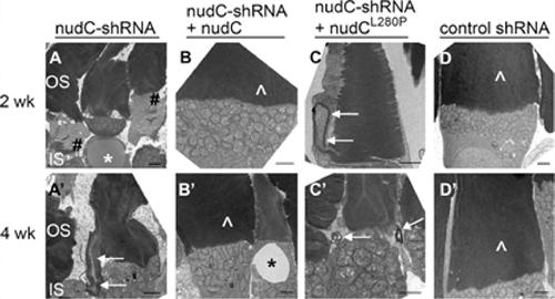 Figure 5- Knockdown of nudC in rod photoreceptors results in overgrowth of disk membranes and ectopic disk formation. AâD) 2âwkâpostfertilization tadpole ultrathin retina sections imaged by TEM. A) Transgenic tadpoles expressing nudC shRNA show dysregulation of new disk formation at the base of ROSs. An accumulation of tubulovesicular membranes near the base of ROSs was observed (#). A â²) Tubulovesicular membrane accumulation at the base of the OS in nudC shRNA retinas has been resolved; however, overgrowth of discs at the base of the OS is observed (arrows). B) Phenotype associated with expression of nudC shRNA is rescued by coexpression of mCânudC with no dysregulation of disk membranes observed. B â²) Rescue of nudC shRNA via coexpression of mCânudC results in normal formation of ROSs based on ultrastructure. C) NudC shRNA is not rescued by coexpression of mCânudCL280P, and large overgrown disks are present at base of OS (arrow). C â²) Animals coexpressing mCânudCL280P and nudC shRNA do not show normal OS disk membranes and have ectopic disks formed at the base of the OS (arrows). D ) Control shRNA directed against firefly luciferase showed no apparent phenotype in X. laevis photoreceptors. A â²âD â²) Ultrathin sections from 4âwkâpostfertilization tadpole retinas imaged by TEM. D â²) Knockdown of firefly luciferase via shRNA shows no adverse effects of OS disk formation. Carets (â§) indicate normal OS disk ultrastructure. Asterisk (*) shows oil droplets contained in X. laevis photoreceptors. Scale bars, 500 nm.