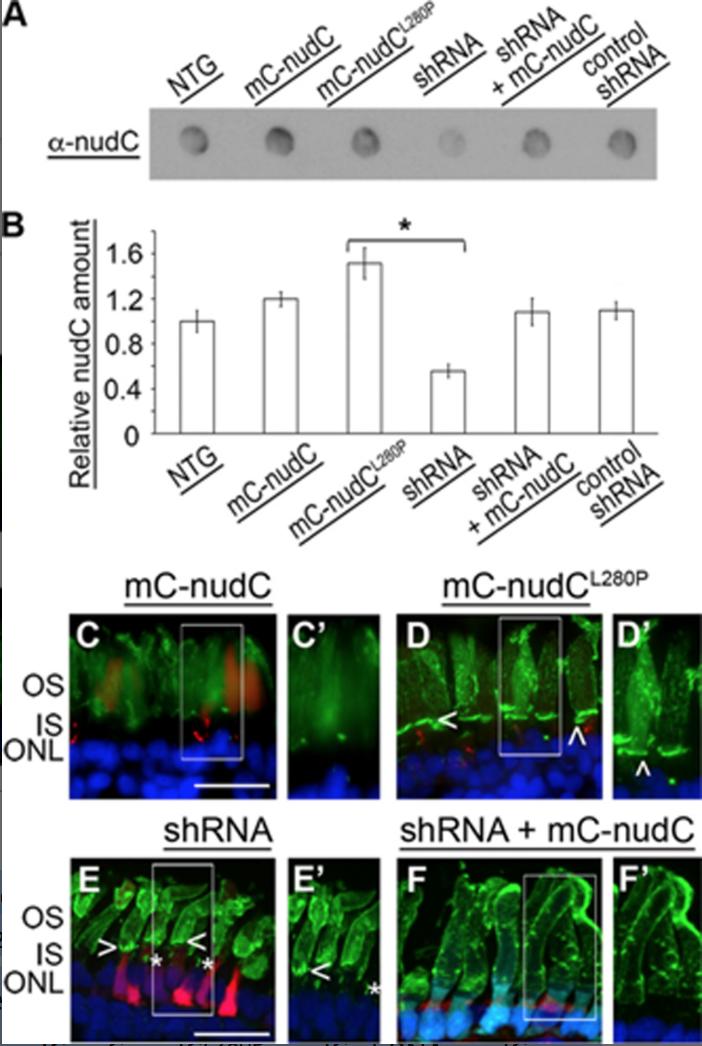 Figure 3- Dot blots of whole tadpoleeyes demonstrate a decrease of nudC in shRNAâtransgenic X. laevis photoreceptors. Expression of mCânudCL280P or nudCâshRNA leads to rhodopsin mislocalization, which is resolved when coexpressing nudCâshRNA and mCânudC. A) Dot blot showing nudCâexpression changes in NTG, mCânudC, mCânudCL280P, nudCâshRNA, nudCâshRNA plus mCânudC rescue, and luciferase shRNA control transgenic animals. B ) Quantification of relative nudC amounts in lysate from whole tadpoleeyes with expression normalized to GAPDH (n = 4â7 per group; 1âway AN OVA, F (4,27) = 4.64, P = 0.007; Tukey's HSD test for mCânudCL280P vs . hairpin, P < 0.01 (*); all other comparisons, P> 0.05). CâF) IHC for rhodopsin (green) in retina cryosections of transgenic X. laevis expressing mCânudC (C , red), mCânudCL280P (D , red), nudCâshRNA (E , red), and coexpression nudCâshRNA (cyan) and mCânudC (red) as a rescue experiment (F ). (D, E ) Intense band of rhodopsin staining at the base of the OS (â§). C â²âF â²) View of rhodopsin IHC without counterstains highlighting protein mislocalization. E) Aberrant rhodopsin in the IS (*). Nuclei marked by DAPI (blue). Scale bars, 20µm.