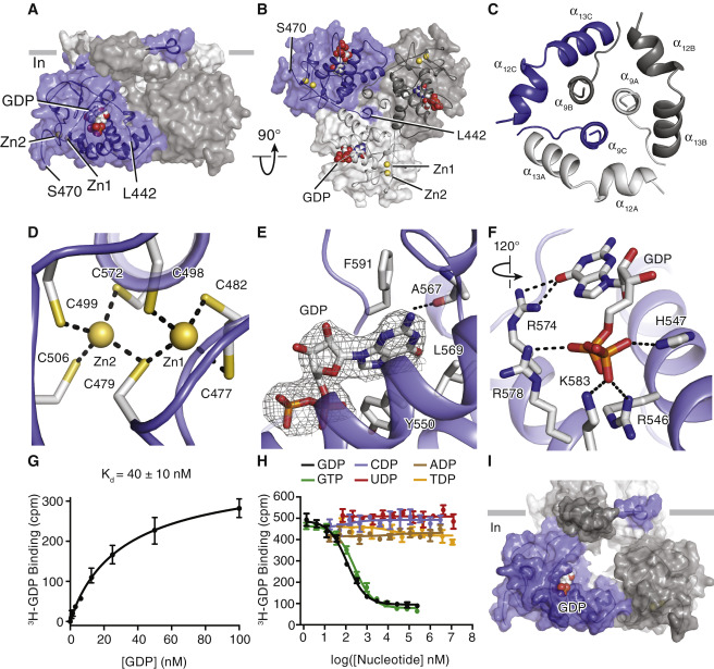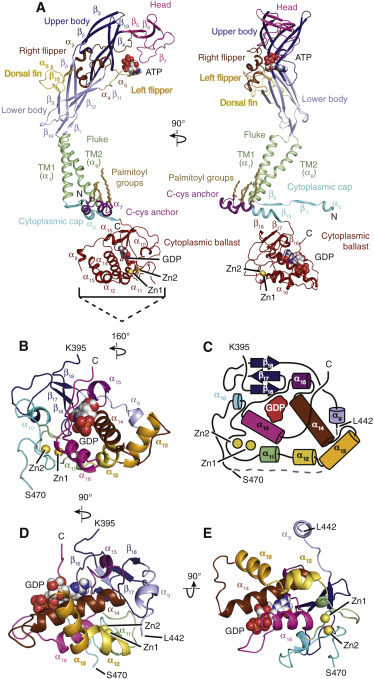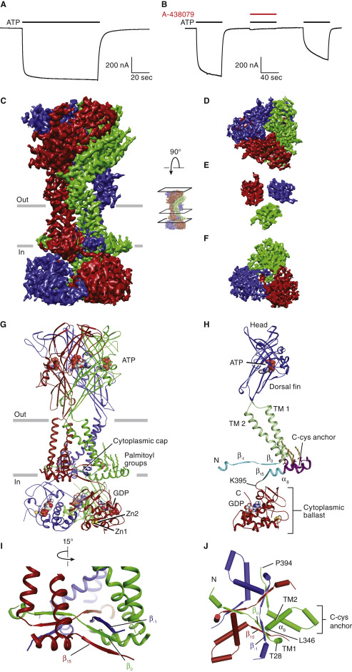 P2X receptors are trimeric, non-selective cation channels activated by extracellular ATP. The P2X7 receptor subtype is a pharmacological target because of involvement in apoptotic, inflammatory, and tumor progression pathways. It is the most structurally and functionally distinct P2X subtype, containing a unique cytoplasmic domain critical for the receptor to initiate apoptosis and not undergo desensitization. However, lack of structural information about the cytoplasmic domain has hindered understanding of the molecular mechanisms underlying these processes. We report cryoelectron microscopy structures of full-length rat P2X7 receptor in apo and ATP-bound states. These structures reveal how one cytoplasmic element, the C-cys anchor, prevents desensitization by anchoring the pore-lining helix to the membrane with palmitoyl groups. They show a second cytoplasmic element with a unique fold, the cytoplasmic ballast, which unexpectedly contains a zinc ion complex and a guanosine nucleotide binding site. Our structures provide first insights into the architecture and function of a P2X receptor cytoplasmic domain.