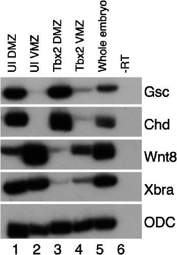 Fig. 1. Tbx2 dorsalizes ventralmesoderm. RT-PCR analysis of marginal zone explants. Embryos were injected radially at early cleavage stages with 1âng of tbx2; marginal zone explants were dissected at stage 10