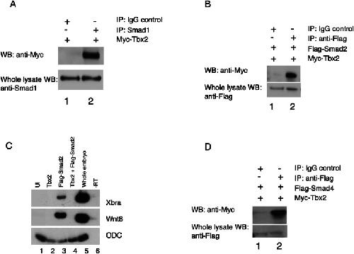 Fig. 2. Tbx2 associates with R-Smads a). Tbx2 physically associates with Smad1. 1âng myc-tbx2 RNA was injected at early cleavage stages. Pull-down of native Smad1 from injected embryos leads to co-immunoprecipitation of exogenous Tbx2. Normal rabbit IgG antibodies were used in parallel studies as a negative control. b Tbx2 physically associates with Smad2. 1âng of myc-tbx2 and 1âng of flag-smad2 were injected at early cleavage stages. Pull-down of Flag-Smad2 from injected embryos leads to co-immunoprecipitation of exogenous Tbx2. Normal rabbit IgG antibodies were used in parallel studies as a negative control c) Tbx2 represses Smad2-mediated mesoderm induction. Embryos were injected with tbx2 (1âng), flag-smad2 (1âng), or tbx2 (1âng) and flag-smad2 (1âng) at the two-cell stage and animal caps were explanted at stage 8.5. d Tbx2 physically associates with Smad4. 1âng of myc-tbx2 and 1âng of flag-smad4 were injected at early cleavage stages. Pull-down of Flag-Smad4 from injected embryos leads to co-immunoprecipitation of of exogenous Tbx2. Normal rabbit IgG antibodies were used in parallel studies as a negative control