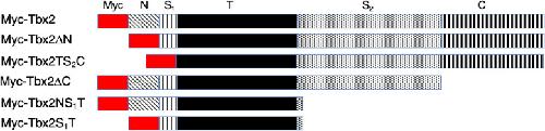 Fig. 3. Depictions of Myc-tagged Tbx2 deletion constructs. âMycâ refers to a 6x Myc epitope tag. N and C refer to the N and C termini, respectively. S1 and S2 refer to the first and second spacer, respectively