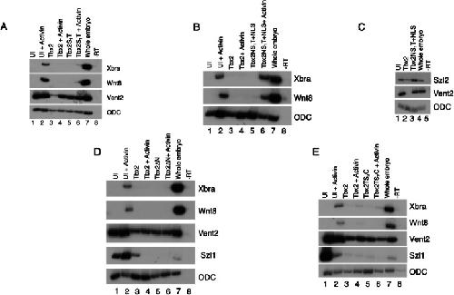 Fig. 5. Effects of Tbx2 deletion constructs on the BMP/GDF and Activin/Nodal pathways a) Embryos were injected with 2âng of tbx2 or tbx2S1T in the animal pole at the two-cell stage. Animal caps were explanted at stage 8.5. Activin was added (2.5âng/ml) as indicated. b Embryos were injected with 2âng of tbx2 or tbx2NS1T in the animal pole at the two-cell stage. Animal caps were explanted at stage 8.5. Activin was added (2.5âng/ml) as indicated. c Embryos were injected with 2âng of tbx2 or tbx2NS1T in the animal pole at the two-cell stage. Animal caps were explanted at stage 8.5. d Embryos were injected with 1âng tbx2 or tbx2ÎN in the animal pole at the two-cell stage. Animal caps were explanted at stage 8.5. Activin was added (2.5âng/ml) as indicated e) Embryos were injected with 1âng tbx2 or tbx2TS2C in the animal pole at the two-cell stage. Animal caps were explanted at stage 8.5. Activin was added (2.5âng/ml) as indicated