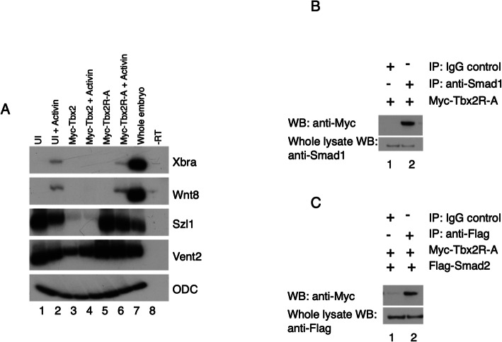 Fig. 7. DNA binding is necessary for Tbx2 repressor activity. a RT-PCR analysis of animal cap explants injected with Tbx2 DNA binding mutant construct. Embryos were injected with 1âng myc-tbx2R-A or myc-tbx2 at the two-cell stage; animal caps were explanted at stage 8.5 and incubated in Activin (2.5âng/ml) where indicated until late gastrula stages. b Smad1 physically associates with Tbx2R-A. Embryos were injected at the two-cell stage with 1âng of RNA synthesized from Myc-Tbx2R-A. Pull-down of native Smad1 from injected embryos leads to co-immunoprecipitation of exogenous Myc-Tbx2R-A. Normal rabbit IgG antibodies was used in parallel studies as a negative control. c Smad2 physically associates with Myc-Tbx2R-A. Embryos were injected at the two-cell stage with 1âng myc-tbx2R-A and 1âng flag-smad2. Pull-down of Flag-Smad2 from injected embryos leads to co-immunoprecipitation of exogenous Myc-Tbx2R-A. Normal rabbit IgG antibodies were used in parallel studies as a negative control