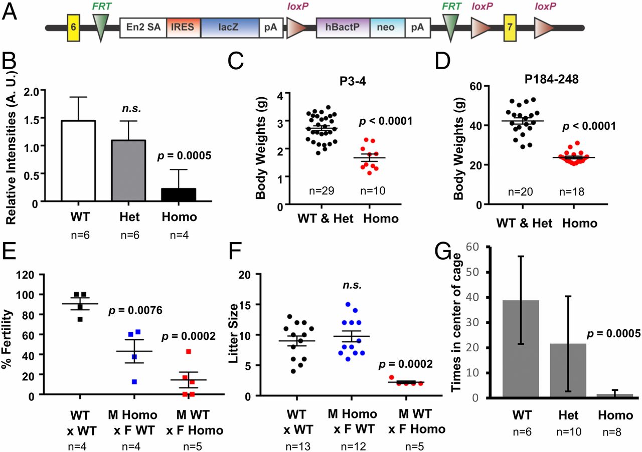Fig 1. Phenotypes of the Camsap3tm1a mouse model. (A) Structure of the Camsap3tm1a allele with an RNA-processing signal/lacZ-trapping element inserted between exons 6 and 7 (indicated as yellow boxes) of the Camsap3 gene. (B) CAMSAP3 expression is significantly decreased in Camsap3tm1a/tm1a. Relative intensities in arbitrary units of CAMSAP3 bands from three independent Western blots using brain lysates from P10 to 11 littermates. Intensities are normalized to tubulin-loading control bands (detected by antiâα-tubulin). (C and D) Body weight is significantly decreased in Camsap3tm1a/tm1a. Weight of neonatal mice ages P3 to 4 (C) and older adult mice ages P184 to 248 (D) versus genotype. (E and F) Fertility and litter size are significantly decreased in Camsap3tm1a/tm1a. Fertility rate (E) and mean litter sizes (F) for breeding pairs of the indicated genotypes. M, male; F, female. (G) Food finding is significantly decreased in older adult Camsap3tm1a/tm1a. Mean number of times mice were found in the center of a cage with hidden food versus genotype. Het, Camsap3tm1a/+; Homo, Camsap3tm1a/tm1a. n, number of animals; n.s., not statistically significant. Error bars are standard deviations from the means.