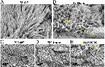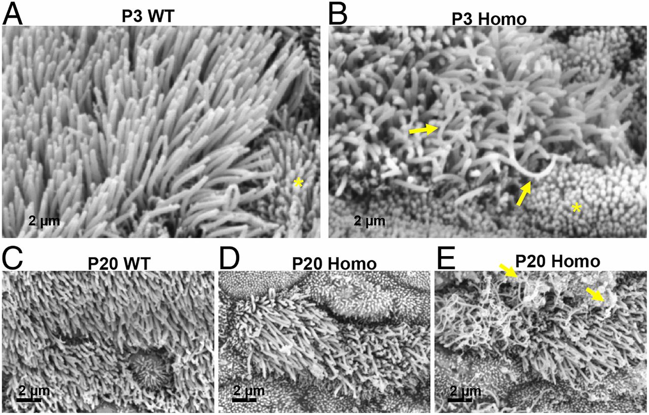 Fig. 3. MCCs from Camsap3tm1a/tm1a have abnormal ciliary morphology. SEM images of nasal MCCs from WT (A and C) and its Camsap3tm1a/tm1a littermate (B, D, and E) at P3 and 20. Arrows in B point to long and curved cilia in Camsap3tm1a/tm1a mice. Nearby microvilli are indicated by asterisks. (E) The surface of MCCs from a Camsap3tm1a/tm1a at P20. Yellow arrows indicate the layer of fibrous substances. (Scale bars, 2 µm.)