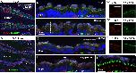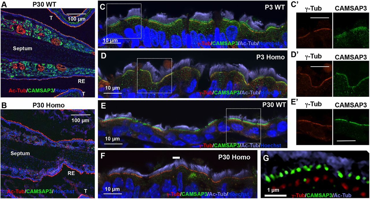Fig. 5. CAMSAP3 is located at the base of axonemes and at the basal bodies. (AâF) Immunofluorescent images of nasal MCCs from WT (A, C, and E) and Camsap3tm1a/tm1a (B, D, and F) at P3 (C and D) and 30 (A, B, and EâG) are shown. Antibodies include antiâCAMSAP3-M (green), antiâγ-tubulin (red), antiâacetylated-α-tubulin (red in A and B and violet in CâG), and Hoechst 33342 (blue, nuclei). Respiratory epithelium (RE). (G) SIM image showing the upper CAMSAP3 line (green dots) and lower line of basal bodies (γ-Tub, red dots). (Scale bars, 100 µm [A and B], 10 µm [CâF], 5 µm [Câ², Dâ², and Eâ²], and 1 µm [G].) Câ², Dâ², and Eâ² are enlarged images of the boxed regions in CâE showing antiâγ-tubulin (red) and antiâCAMSAP3-M (green) channels.