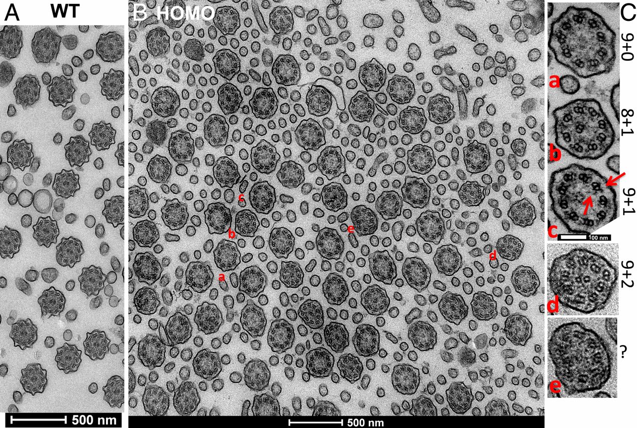 CAMSAP3 is needed for the formation of central MT pairs in axonemes. TEM images showing MT arrays in axonemes from an adult P30 WT (A) compared with a P30 Camsap3tm1a/tm1a (B). Five different axoneme MT configurations (aâe) are listed in C. Red arrows point to inner and outer dynein arms in outer MT doublets. (Scale bars, 500 nm [A and B] and 100 nm [C]