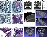 Fig 2. Camsap3tm1a/tm1a mice have obstructed nasal cavities and abnormal nasal cavity structure. (AâD) Mucin blocks the nasal airway and obstructs the olfactory epithelium in older Camsap3tm1a/tm1a mice. PAS staining for glycoproteins in coronal nasal sections in WT (A) showing a patent anterior nasal airway (A) with a central bony septum at the level of the vomeronasal organ compared with mucin buildup (B) (purple) in Camsap3tm1a/tm1a with a deviated septum (arrows). WT (C) patent nasal airway with a central septum at a level where the ethmoid turbinates (T) are covered primarily with olfactory sensory epithelium compared with Camsap3tm1a/tm1a (D) with almost total airway (a) blockage with mucin (purple). (Scale bars, 500 µm.) (EâH) Mucin blocks the nasal airway of young adult Camsap3tm1a/tm1a mice. PAS staining shows a normal opening to the Eustachian tube (Et) in WT mouse (E), while its Camsap3tm1a/tm1a littermate exhibited mucin accumulation (m) and folding of epithelial cell layers (white arrows) in the Eustachian tube (F). (Scale bars, 50 µm.) Micro-CT images showing dark and radiopaque regions at the back of the nasal cavity in WT (G) and Camsap3tm1a/tm1a (H), respectively. White arrows indicate blockage. A calibration bar is as indicated. Hu, Hounsfield units. (IâM) Representative rendered 3D images obtained by thresholding of CT data in WT and Camsap3tm1a/tm1a are shown. Snout details from the region outlined in red in I are shown for different orientations for WT (J and L) and Camsap3tm1a/tm1a (K and M) mice. An orientation axis for each figure is shown in the corresponding inset. The white arrows in (L) and (M) point at the snout region with most structural differences between the WT and Camsap3tm1a/tm1amouse.