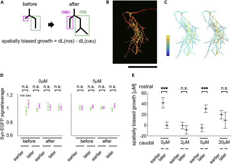 Figure 5. Reversal of Directed Arbor Growth in Neighboring Sub-arbors(A) Analysis of spatially biased growth of sub-arbors. Sub-arbors were defined as rostral or caudal according to the gravity center of the branch positions. Spatially biased growth was quantified as the difference in the change in branch length between the rostral and the caudal sub-arbors over the imaging interval. All branching points were analyzed, and the data were pooled (Figures S3 and S4).(B) An image of an axon expressing tdTomato and synaptophysin-EGFP to identify synaptic puncta.(C) Reconstruction of the axon in (B) with branches color-coded according to the intensity of the synaptophysin-EGFP signal. Red dots identify the puncta locations. Synaptophysin-EGFP intensity per branch length was measured and normalized to mean value across the axon. Right: overlay of puncta.(D) Plot of synaptophysin-EGFP intensity per unit branch length between neighboring rostral and caudal branches. Data are from animals treated with or without DL-APV and before and after 2 days of visual stimulation with the dt = ±15-ms protocol. No significant difference was detected. See Table S2 for data and p values.(E) Differences in branch lengths between the sibling sub-arbors across DL-APV doses for axons from earlier- or later-stimulated conditions. In controls, sub-arbors in earlier-stimulated axons showed a rostral spatial bias in sub-arbor growth, but in 5 μM APV, sub-arbors in later-stimulated axons showed a rostral growth bias. âââp < 0.001. Bootstrap test, N = 10,000. (0 μM: earlier group: N = 100 branch points, 7 animals; later group: N = 132 branch points, 7 animals. 5 μM: earlier group: N = 213 branch points, 7 animals; later group: N = 120 branch points, 7 animals). See Table S2 for data and p values. |