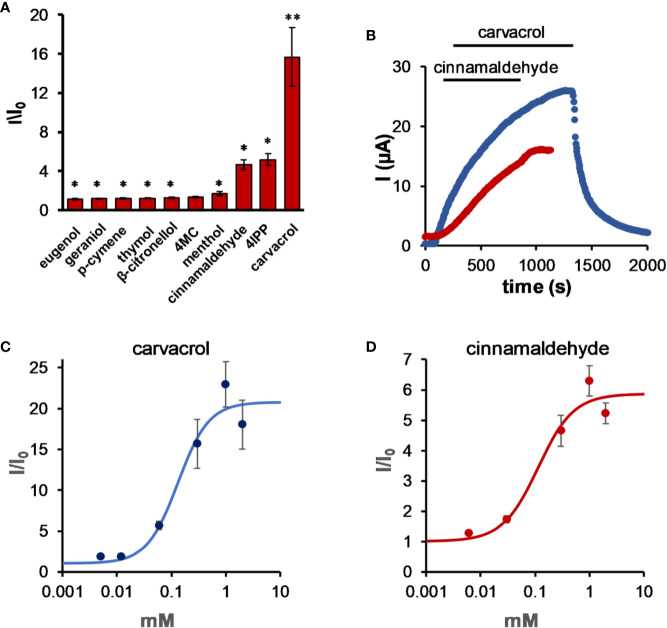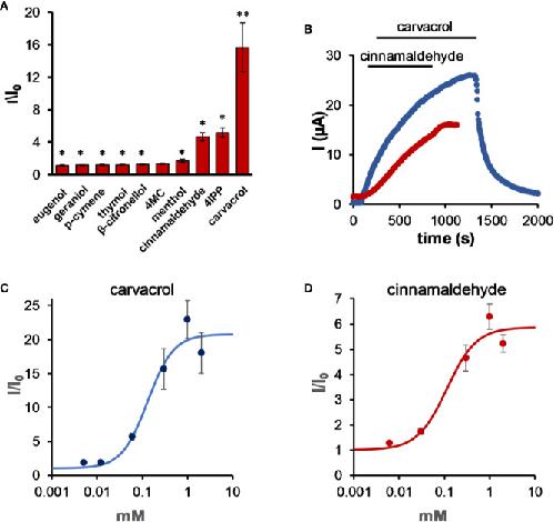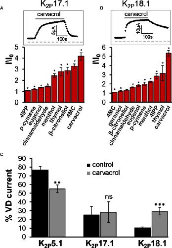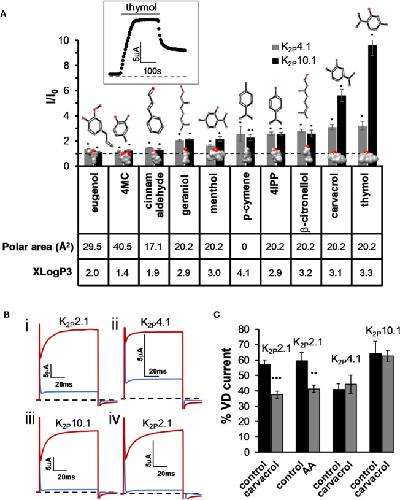 Potassium K2P ("leak") channels conduct current across the entire physiological voltage range and carry leak or "background" currents that are, in part, time- and voltage-independent. The activity of K2P channels affects numerous physiological processes, such as cardiac function, pain perception, depression, neuroprotection, and cancer development. We have recently established that, when expressed in Xenopus laevis oocytes, K2P2.1 (TREK-1) channels are activated by several monoterpenes (MTs). Here, we show that, within a few minutes of exposure, other mechano-gated K2P channels, K2P4.1 (TRAAK) and K2P10.1 (TREK-2), are opened by monoterpenes as well (up to an eightfold increase in current). Furthermor\e, carvacrol and cinnamaldehyde robustly enhance currents of the alkaline-sensitive K2P5.1 (up to a 17-fold increase in current). Other members of the K2P potassium channels, K2P17.1, K2P18.1, but not K2P16.1, were also activated by various MTs. Conversely, the activity of members of the acid-sensitive (TASK) K2P channels (K2P3.1 and K2P9.1) was rapidly decreased by monoterpenes. We found that MT selectively decreased the voltage-dependent portion of the current and that current inhibition was reduced with the elevation of external K+ concentration. These findings suggest that penetration of MTs into the outer leaflet of the membrane results in immediate changes at the selectivity filter of members of the TASK channel family. Thus, we suggest MTs as promising new tools for the study of K2P channels' activity in vitro as well as in vivo.