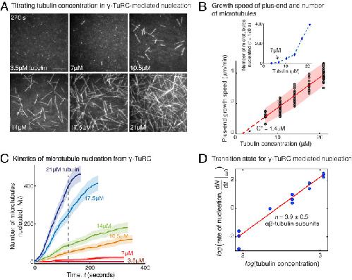 Figure 2. Molecular composition of transition state in γ-TuRC-mediated nucleation.(A) Titrating tubulin concentration with constant the density of γ-TuRC. MT nucleation from γ-TuRC begins at 7μM tubulin. (B) MT plus-end growth speed increases linearly with tubulin concentration. Individual data points are plotted, and linear fit (red line) with shaded mean±2std (95% confidence interval) is displayed. Critical concentration for polymerization as C* = 1.4 μM. Inset: Number of MTs nucleated by γ-TuRCs within 120 s varies non-linearly with tubulin concentration. (C) Number of MTs nucleated (N(t)) over time (t) is plotted for varying tubulin concentration to obtain rate of nucleation as the slope of the initial part of the curves. Shaded regions represent 95% confidence interval (n±2n) in the number of nucleated MTs (n) assuming a Poisson distribution as described in Materials and methods. (D) Number of tubulin dimers (n) in the critical nucleus on γ-TuRC was obtained as 3.9±0.5 from the equation dNdt|tâ0=kCtubn displayed on a log-log axis as detailed in Materials and methods. The rate of nucleation at 10.5 μM was set to 1 to normalize differences in γ-TuRC concentration from individual experiments. The experiments and analyses in (AâD) were repeated identically three times with independent γ-TuRC preparations. MT nucleation data, prior to normalization, from one representative dataset is displayed in (BâC). Analyses from all repeats was pooled and normalized as described above, and data points from 15 nucleation-time curves are plotted in (D). See Video 3.Figure 2âsource data 1. Source data for Figure 2BâD.Each excel sheet is labelled with individual figure panel. For Figure 2C, all three experimental replicates are supplied, and dataset one is plotted. |