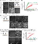 Figure 3. Comparison of γ-TuRC-mediated, spontaneous and seed-templated nucleation.(A) Spontaneous MT nucleation (schematized) was measured with increasing tubulin concentration and high concentrations. 14 μM tubulin is required. (B) Number of MTs (N(t=Ï)) nucleated spontaneously were plotted against tubulin concentration. Power-law curve was fit as N(t=Ï)=kCn on a log-log axis, and linear scale in the inset. Tubulin cooperativity (exponent) of n = 8.1±0.9 was obtained as detailed in Methods. Experiments and analyses in (AâB) were repeated thrice independently, all data were pooled and data points from 11 nucleation curves are plotted in (B). In the inset, data is represented in linear plot, where shaded regions represent 95% confidence interval (n±2n) in the number of nucleated MTs (n) assuming a Poisson distribution as described in Materials and methods. Scale bars, 10μm. (C) Schematic and an example micrograph of blunt, stabilized MT seeds is shown and MT assembly from them was observed (bottom) with varying tubulin concentration. (D) Cumulative probability of MT assembly from seeds (p(t)) over time (t) is plotted and rate of nucleation was obtained as the slope from initial part of the curves. Shaded regions represent 95% confidence interval (n±2n) in the number of MTs assembled (n) from seeds as described in Materials and methods. (E) As described in Methods, the measurements fit well to equation dpdt|tâ0=k(CâCâ)n displayed on a log-log plot. n = 1±0.3 was obtained showing nearly non-cooperative assembly of tubulin dimers. The experiments and analyses in (CâE) were repeated three times independently. MT nucleation data, prior to normalization, from one representative dataset is displayed in (CâD). Analyses from all experiments was pooled, and data points from a total of 11 nucleation-time curves are reported in (E). See Figure 3âfigure supplement 1 and Videos 4 and 5.Figure 3âsource data 1. Source data for Figure 3 panels B, D, E and Figure 3âfigure supplement 1CâD.Each excel sheet is labelled with individual figure panel. For Figure 3D, all three experimental replicates are supplied, and dataset one is plotted.Figure 3âfigure supplement 1. Controls for spontaneous and blunt seed-mediated microtubule nucleation.(A) Representative kymographs of spontaneously nucleated MT is displayed, demonstrating that MTs grow from both the minus-end (dotted line) and the plus-end (solid line) and can be distinguished from γ-TuRC-mediated nucleation. Scale bar, 10 μm. Tens of kymographs were generated from at least three independent experiments. (B) Comparison of γ-TuRC-mediated with spontaneous MT nucleation and reactions where γ-TuRC was not attached. MTs were nucleated by attaching purified γ-TuRC (left), adding control buffer to allow for spontaneous MT nucleation (middle) or leaving avidin out to test the level of nucleation by non-specifically attached γ-TuRCs (right). Robust MT nucleation only occurs with γ-TuRC attached to coverslips and not in control reactions. Scale bar, 10 μm. (C) MTs nucleation from γ-TuRCs or spontaneously were compared directly at 10.5 μM tubulin concentrations. Shaded regions represent 95% confidence interval (n±2n) in the number of nucleated MTs (n) assuming a Poisson distribution as described in Materials and methods. γ-TuRC nucleates significantly higher number of MTs than spontaneous assembly. The experimental set and analyses in (BâC) were repeated identically two times with independent γ-TuRC preparations. (D) MTs were assembled from blunt seeds. Tubulin concentration was titrated, and growth speed of MT plus-ends was measured from kymographs (blue circles). Critical concentration (C* = 1.4 μM) was determined from the linear fit (blue line) with shaded 95% confidence intervals. The experiment and analyses in were repeated thrice with independent seed preparations. The growth speed of MTs assembled from seeds was overlaid with those nucleated from γ-TuRC (Figure 2B, red circles and line) for comparison. See also Videos 3, 4, 5 and Figures 2, 3. |