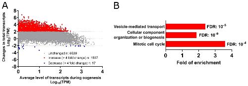 Figure 2. Changes in the total mRNA level during the growth period. (A) Changes in mRNA levels between stages I–II (starting of the growth period) and stages V–VI (end of the growth period) have been plotted. (B) Selection of the gene ontology terms enriched among the 1557 transcripts whose levels increase during the growth period. |