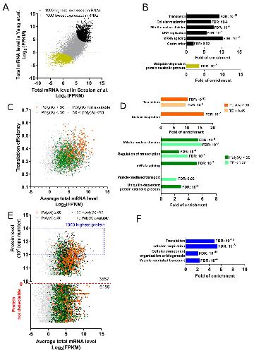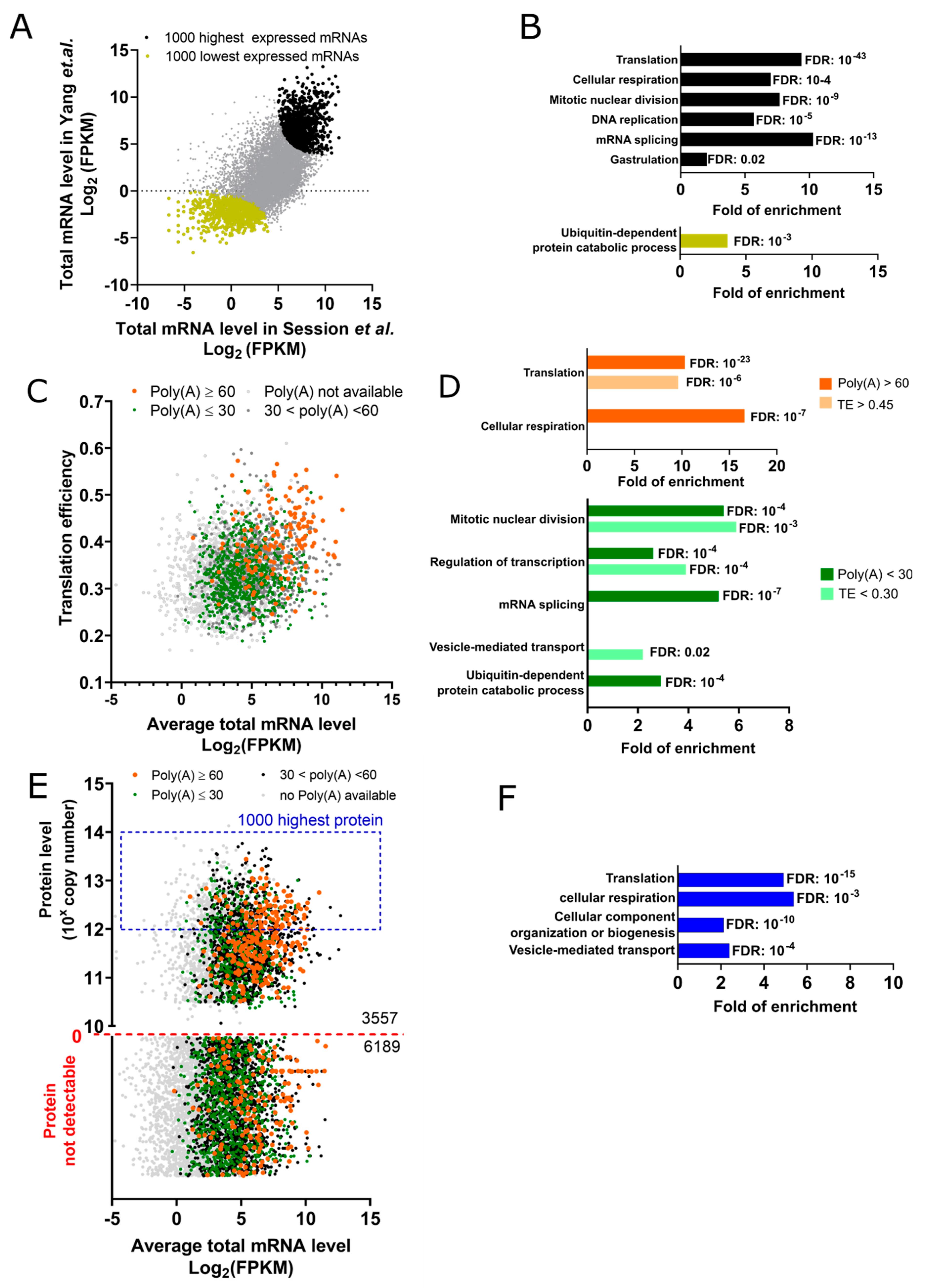 Figure 3. Genome-wide analysis of the fully-grown prophase-arrested oocytes. (A) The expression level of each mRNA quantified using two independent published datasets [37,72]. Each transcript is ranked in the two databases according to its level of expression. The average rank is used to highlight the 1000 transcripts with either the lowest (yellow) or the highest level of expression (black). (B) Gene ontology terms enriched among 1000 highest (black) or 1000 lowest (yellow) expressed transcripts from panel A. (C) The translation efficiency (TE) is defined as the fraction of mRNAs recovered in the polysomes divided by the concentration of total mRNAs of each transcript. TE has been correlated with its total level [37,72]. The extent of the poly(A) tail length has been color-coded: black (30 to 60 nt), green (â¤30 nt), orange (â¥60 nt), grey (poly(A) length not available). (D) Gene ontology terms enriched among the transcripts with poly(A) tail ⥠60 nucleotides (dark orange) and TE ⥠0.45 (light orange) or among poly(A) tail ⤠30 nucleotides (dark green) and TE ⤠30 (light green) from panel C. (E) The expression level of each protein is compared to the level of its mRNA [37,70,72]. The same color code as panel C is applied for the poly(A) length. (F) Gene ontology terms enriched among 1000 highest expressed proteins from panel E. |