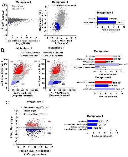 Figure 4. Genome-wide analysis of oocytes during meiotic maturation. (A) Changes in total mRNA levels [37,72]. Left panel: Changes between prophase I and metaphase I oocytes. Blue: mRNAs, whose level decreases more than 2-fold. Middle panel: Changes between prophase I (Pro I) and metaphase II (Met II) oocytes. The average rank is used to highlight the 1000 transcripts whose levels decrease the most during this period of meiotic maturation (blue). Right panel: Selection of the gene ontology terms enriched among the 1000 mRNAs from the middle panel. (B) Changes in the poly(A) tail length of each mRNA during meiotic maturation [72]. A color-code depicts 4 groups of transcripts. Light red: constitutively activated transcripts with poly(A) tail ⥠60 nt at all periods; dark red: activated mRNAs whose poly(A) tail increases, at least, by 10 nt and is longer than 60 nt in Met I/Met II; light blue: constitutively repressed mRNAs with poly(A) tail ⤠30 nt at all periods; dark blue: repressed mRNAs whose poly(A) tail decreases more than 10 nt and is shorter than 30 nt in Met I/Met II. Left panel: Changes between prophase I and metaphase I (Met I) oocytes. Middle panel: Changes between prophase I and metaphase II (Met II) oocytes. Right panel: Selection of the gene ontology terms enriched among the 4 groups of transcripts. (C) Left panel: Changes in the protein levels between prophase I and metaphase II oocytes [70]. The proteins whose copy number increases or decreases more than 2-fold are colored in red or blue, respectively. Right panel: Selection of the gene ontology terms enriched among the proteins whose level decreases more than 2-fold, from the right panel. |