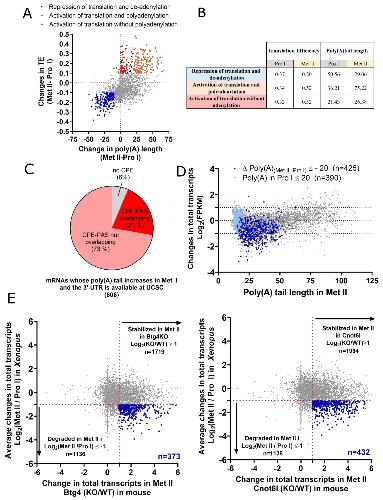 Figure 5. The relationship between poly(A) tail length, translation, and mRNA degradation. (A) Changes in translation efficiency (TE) and in the poly(A) tail length between fully-grown prophase (Pro I) and metaphase II (Met II) oocytes [72]. Transcripts are divided into three groups: transcripts whose poly(A) tail decreases, at least, by 10 nt and TE decreases, at least, by 0.1 (blueârepression of translation and de-adenylation), transcripts whose poly(A) tail increases less than 10 nt and TE increases more than 0.1 (redâactivation of translation without polyadenylation), and mRNAs whose poly(A) tail increases more than 20 nt and TE increases, at least, by 0.1 (orangeâactivation of translation and polyadenylation). (B) Median values of translation efficiency and poly(A) tail length of the three groups described in panel A. (C) 3â²-UTRs of the mRNAs whose poly(A) tail increases, at least, by 10 nt and is longer than 60 nt in metaphase I (Met I) oocytes are retrieved from the UCSC database. Sequences of cytoplasmic polyadenylation elements (CPEs) and CPE overlapping the PAS from Pique et al. [92] are searched within the 3â²-UTRs. The pie chart represents the percentage of transcripts containing at least one CPE or one CPE overlapping the PAS or none. (D) Changes in total mRNA levels between fully-grown prophase (Pro I) and metaphase II (Met II) oocytes are compared to the length of the poly(A) tail in Met II oocytes [72]. A color-code depicts two groups. Light blue: mRNAs with a poly(A) tail length ⤠20 in both Pro I and Met II oocytes; dark blue: mRNAs whose poly(A) tail length decreases, at least, by 20 nt between both stages. (E) Changes in the total mRNA levels between fully-grown prophase I (Pro I) and metaphase II (Met II) in Xenopus oocytes [72] are compared with mRNAs that are stabilized in btg4 (left panel) or cnot6l (right panel) knockout mouse Met II oocytes [114]. Blue: transcripts degraded in Xenopus Met II oocytes and stabilized in btg4 (left panel) or cnot6l (right panel) knock-out mouse Met II oocytes. |
