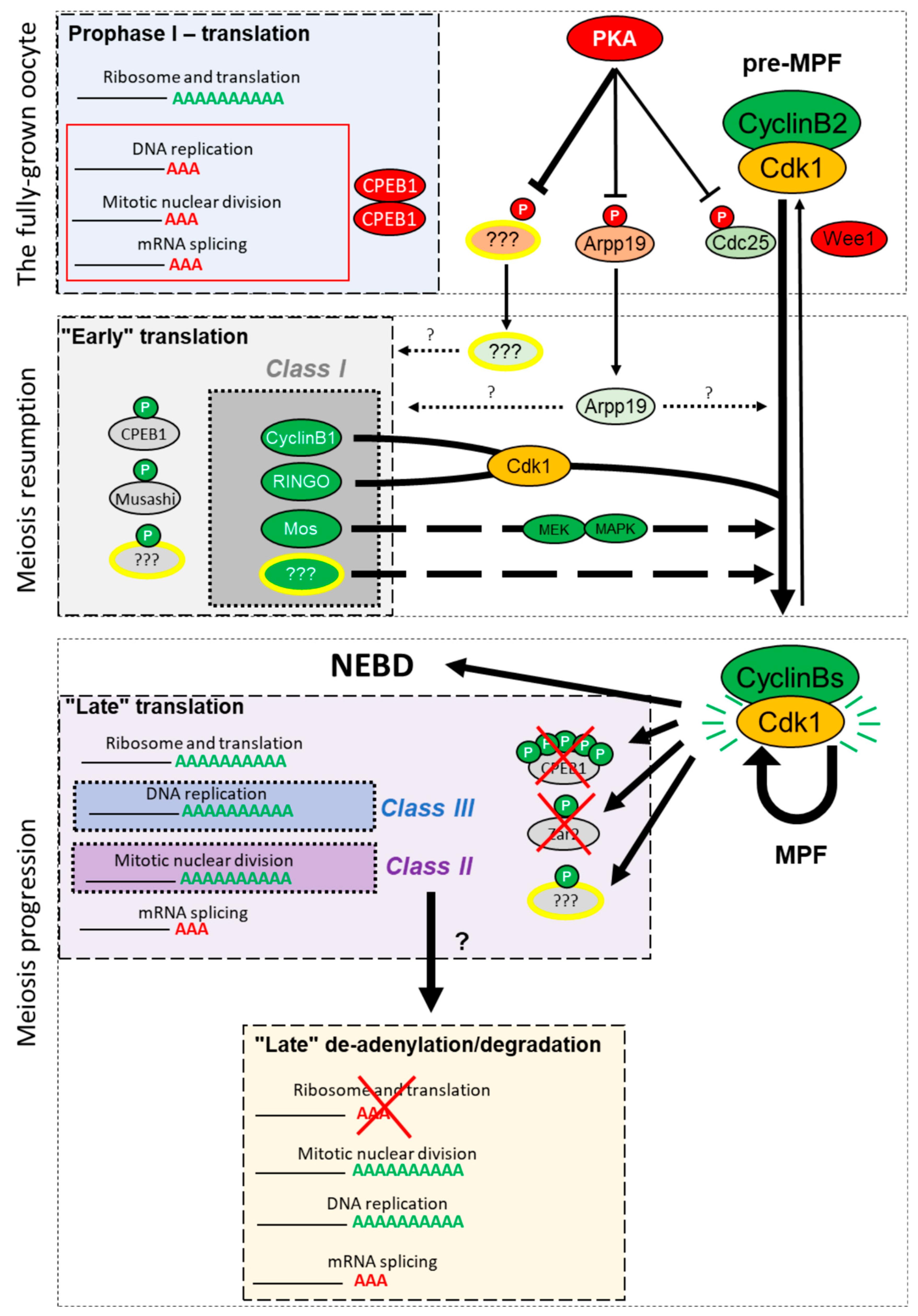 Figure 6. The bidirectional regulation between protein translation and meiosis progression. The fully-grown prophase-arrested oocyte actively translates proteins related to cell metabolism and ribosome biogenesis. mRNAs encoding proteins involved in M-phase progression, DNA replication, and mRNA splicing exhibit short poly(A) tails and are stored for future translation. The prophase arrest is maintained by the high activity of protein kinase A (PKA) and the phosphorylation of its substrates, which indirectly inhibit the activation of the M-phase promoting factor (MPF). In the vertebrates, the prophase arrest is released by a decrease of PKA activity and the dephosphorylation of PKA substrates. De novo protein synthesis occurs before NEBD (âEarlyâ translation), and a sub-group of the de novo synthesized proteins is required to activate Cdk1 (Class I). Two RNA-binding proteins (RBPs) have been involved in the activation of the early translation waveâCPEB and Musashi. Once activated, Cdk1 activates the âlate translationâ (purple box). This second translation wave involves the phosphorylation and degradation of inhibitory RBPs, including CPEB1 and Zar2. The translated proteins are involved in meiosis progression (Class II), support embryonic cell divisions, such as components of the DNA replication machinery (Class III), and further contribute to regulating RNA translation and degradation by de-adenylation in metaphase II. Among the transcripts that are de-adenylated are ribosome compounds and translation initiation factors. |