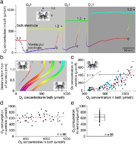Fig. 2. Influence of bath O2 concentrations on ventricular O2 levels. a Recording of O2 levels in the bath and ventricle following stepwise increase of the bath O2 concentration from ~â290âμmol/l (air-saturated) to ~â550âμmol/l (light gray area), ~â750âμmol/l (gray area), and ~â950âμmol/l (dark gray area); the O2-electrode was initially advanced to the ventricular floor in 0.2âmm steps (left in a) and transiently repositioned to 1.2âmm above the floor (*) prior to each increase of the bath O2 concentration. b O2 concentration profiles (meanâ±âSEM) of ventricular depth tracks (see insets) in air-saturated (~â290âμmol/l) bath solution (1; Nâ=â31) and after the increase of the bath O2 concentration to ~â550âμmol/l (2; Nâ=â6), ~â750âμmol/l (3; Nâ=â6), and ~â950âμmol/l (4; Nâ=â6). c Scatter plot, depicting the dependency of the ventricular O2 concentration (black and red dots; nâ=â97 from 24 preparations) and adjacent hindbrain (blue dots; nâ=â69 from 11 preparations) from bath O2 levels; red dots represent the meanâ±âSEM of the ventricular O2 level at distinct bath O2 concentrations and the red dashed lines linear regressions through the lower (r2â=â0.98) and higher (r2â=â0.96) range of mean ventricular concentrations, respectively. d, e Scatter plot (d) and boxplot (e) depicting ventricular O2 consumption as function of the bath O2 level for concentrations >â700âμmol/l (nâ=â90 from 13 preparations) with a meanâ±âSEM of 626â±â13âμmol/l (e); the slope of the regression line in d (r2â=â0.007) is not significantly different from zero (pâ=â0.42). O2 levels in a and b are color-coded from blue (0âμmol/l) to red (300âμmol/l) to yellow (600âμmol/l) to green (750âμmol/l) to cyan (900âμmol/l); transverse hindbrain schemes indicate motion (a) or position (b, c) of the O2 electrode. N, number of preparations; n, number of measurements