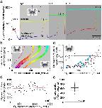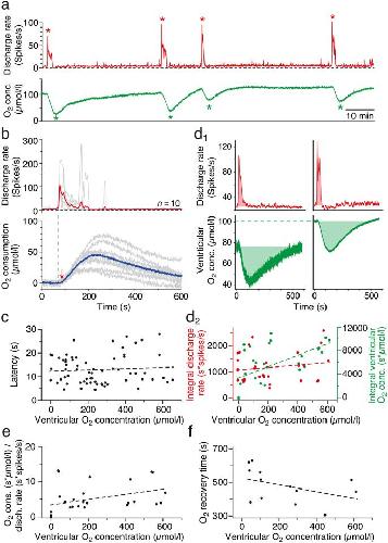 Fig. 5. Systematic correlation between neuronal activity and ventricular O2 levels. a Superior oblique nerve firing rate profile (red trace) of four successive spike bursts (red *) and concurrent alterations of the ventricular O2 concentration (green trace and *) at a ventricular O2 level of ~â100âμmol/l. b Overlay of spike burst episodes (nâ=â10) from one preparation and corresponding increases in ventricular O2 consumption (gray traces in the upper and lower plot) along with the respective averages (red and blue traces); vertical dashed line and red arrow indicate the latency of the O2 transient relative to spike burst onset. c Latency of O2 transients (nâ=â69 from 10 preparations) as function of ventricular O2 concentrations; the slope of the linear regression was not significantly different from zero (r2â=â0.004; pâ=â0.61). d Integrals of spike bursts and concurrent O2 transients (light red and light green areas in d1, respectively) at a lower (left in d1) and a higher ventricular O2 level (right in d1; green dashed line); d2 shows the dependency of spike burst (red circles) and O2 transient integrals (green circles) on ventricular O2 levels (nâ=â30 from 10 preparations); note that the integrals of the spike bursts were independent from (red dashed line; r2â=â0.03; pâ=â0.38), whereas those of the O2 transients significantly increased (green dashed line; r2â=â0.37; pâ<â0.001) with higher ventricular O2 levels. e, f Dependency of the ratio of O2 consumption and spike burst integral (e; nâ=â30 from 10 preparations) and of the O2 recovery time (f) from ventricular O2 levels (nâ=â13 from 6 preparations); note that the slope of the linear regression of the O2/firing rate (e) was significantly different from zero (r2â=â0.14; pâ<â0.05), whereas that of the O2 recovery (f) was not (r2â=â0.18; pâ=â0.15). n, number of measurements